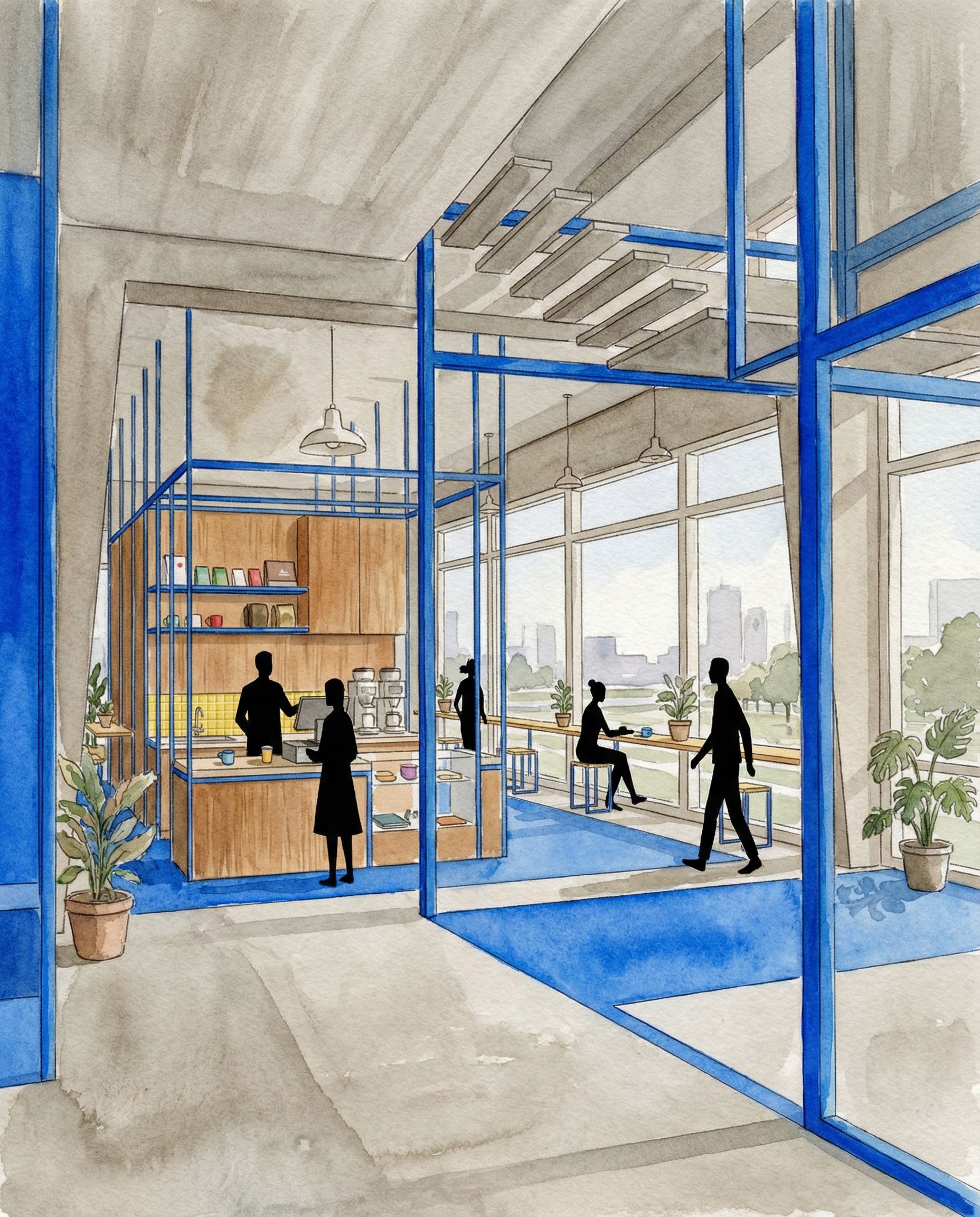 IMPORTANT STRICT: Do NOT change the shapes in any way. Do not modify forms, proportions, thicknesses, silhouettes, or any geometry. No “creative reinterpretation”. Keep the reference EXACTLY: same layout, same camera angle, same framing, same positions. Only apply materials + style, and add ONLY entourage people, plants, lamps without affecting existing forms. Create an interior PERSPECTIVE view based on the reference regular perspective, keep the same viewpoint and framing. Maintain clean architectural readability: crisp edges, controlled depth, no fisheye distortion, no dramatic cinematic lighting. COLOR RULE VERY IMPORTANT: EVERYTHING that is blue in the reference must stay a BRIGHT, SATURATED VIVID BLUE strong primary blue. Do not desaturate it, do not shift hue, do not make it pastel. GRAPHIC STYLE: match the floor-plan presentation vibe—slightly grainy paper feel, clean vector-like linework, limited palette, tidy and controlled. Not photorealistic, not over-rendered. MATERIALS & FINISHES apply neatly, no redesign: - Floor: fair-faced architectural concrete smooth, realistic, slightly warm grey, subtle pores, clean. - Walls and main surfaces: exposed concrete as well consistent tone, high-quality, not dirty. - Blue structural frames/beams: steel elements matte/satin metal BUT keep their visible color as BRIGHT VIVID BLUE. - Blue floor areas: continuous wayfinding floor markings made of colored epoxy resin coating or durable vinyl inlay smooth surface, slightly reflective, not carpet BUT keep the color as BRIGHT VIVID BLUE. - Kitchen back wall: warm wood cladding / wood panels clean joints. - Yellow tile: ONLY a small, narrow backsplash strip exactly like in the original—do NOT enlarge it. STAIR keep exactly: The stair is a Mittelholmtreppe single central stringer stair. Keep the stair exactly as it is and in the same position. Do not change any stair elements. PEOPLE EXTREMELY IMPORTANT: add 5–10 HUMAN SILHOUETTES that match the REFERENCE STYLE. They must be BLACK, flat 2D cutout shapes, extremely minimal and graphic. NO realism: no faces, no hair, no clothing folds, no textures, no shading. Just simple iconic silhouettes like vector entourage. Correct scale and perspective only. LIVELINESS / ENTOURAGE: add a few plants and small decorations to make it feel alive, but keep it minimal and tidy: - 2–5 potted plants placed naturally near seating/corners - a few small everyday objects on shelves/counter cups, notebooks, no readable text - add simple lamps/light fixtures pendants or linear fixtures in a clean modern style; do not change ceiling forms. BACKGROUND OUTSIDE WINDOWS: show a subtle Düsseldorf Germany/NRW context outside the windows: calm European urban/park scenery, soft overcast daylight. Not American: no US signage, no skyscraper skyline, no palm trees. Keep it soft and not too detailed. QUALITY CONTROL avoid glitches: materials must be clean and believable with NO AI artifacts: - no warped textures, no stretched patterns, no random stains - no melting edges, no distorted geometry - no inconsistent texture scale - keep everything sharp and presentation-ready Output high resolution, clean and readable for an architecture presentation board. No labels, no dimensions, no logos.