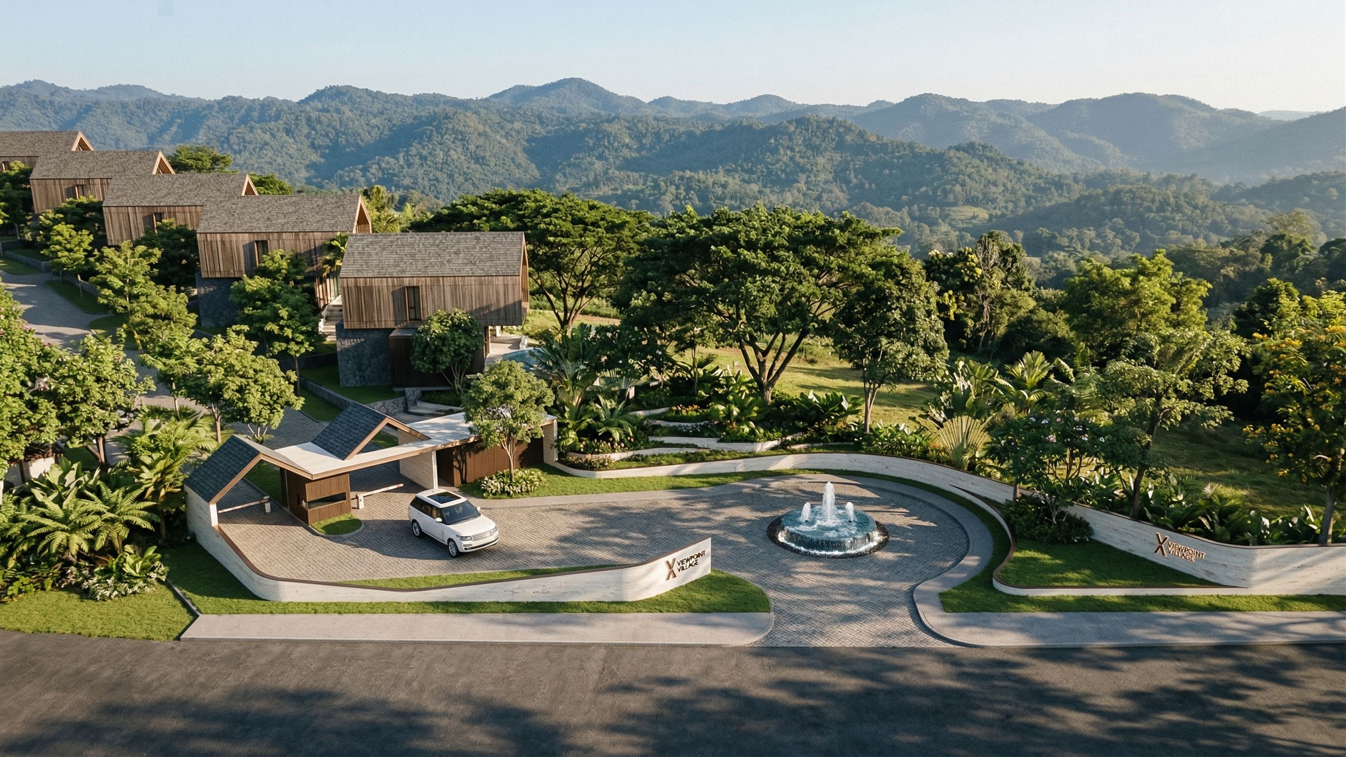 PromptA photorealistic architectural rendering of an ultra-luxury village entrance gateway and signage located in Khao Yai, Thailand. The design follows the composition and perspective of the reference image, featuring a Luxury Minimal style. The gateway structure is defined by striking White Travertine stone walls and rich Bronze metal accents. Raking morning sunlight grazes across the wall surfaces, casting beautiful, intricate dappled shadows of trees onto the curved stone façade. The project name and logo, made of Bronze, are elegantly mounted on the entrance wall. The gateway features a prominent gable-shaped roof with dark gray asphalt shingle roofing. The surrounding environment is lush and shady, filled with large mature trees and diverse tropical flora, with leaves glistening in the morning light. A scenic view of the surrounding Khao Yai mountain ranges forms the background. High-resolution, cinematic lighting, incredibly detailed., keep exact camera angle