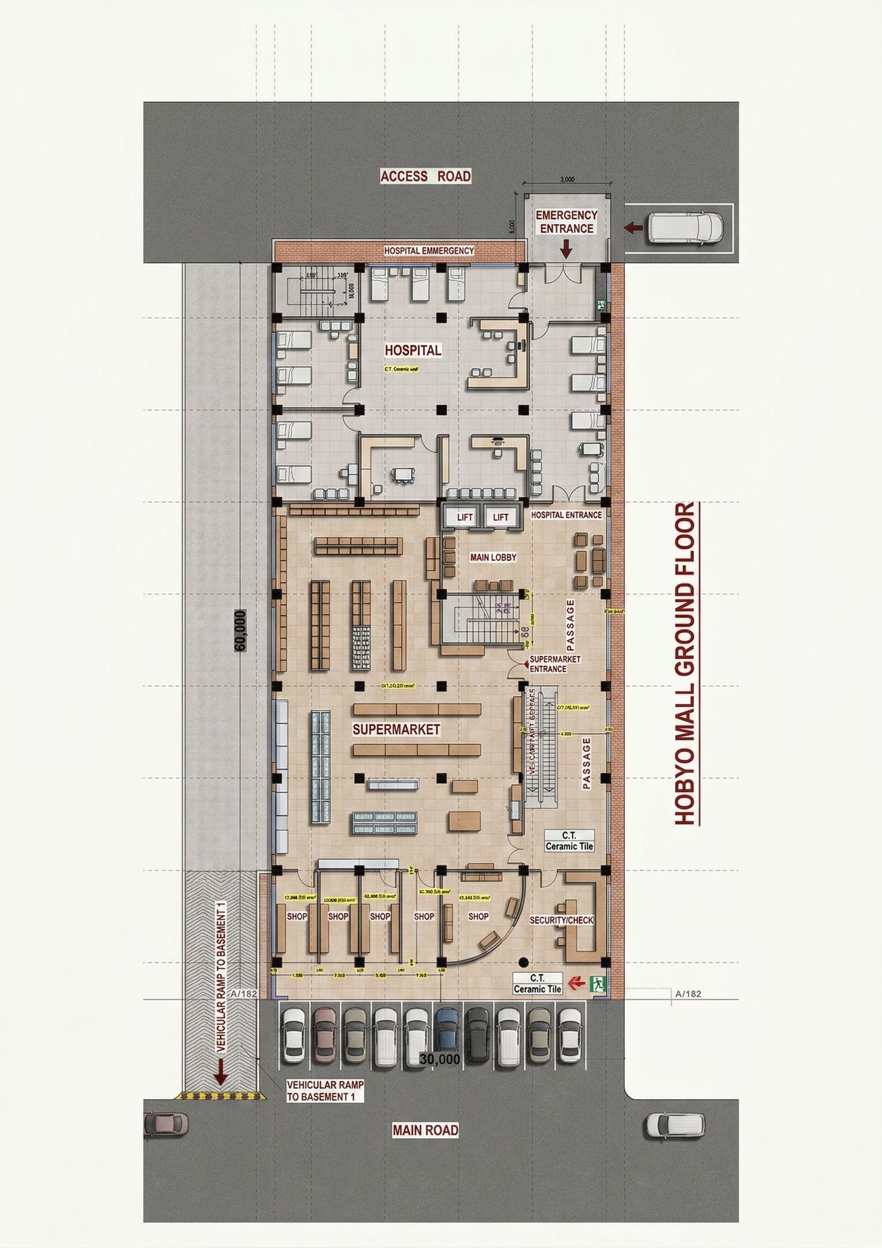 LAYOUT SHOWING A SUPERMARKET ON THE LOWER SIDE AND A HOSPITAL ON THE UPPER END. CLEARLY SHOW PARTITIONS AND ACCESSES , LIFT LOBBY, STAIRCASES AND PARKING BOTH AT FRONT AND BACK ROAD. USE CERAMIC FLOOR TILES ON THE FLOOR. SHOW THE VEHICULAR RAMP TO BASEMENT 1. MAKE LAYOUT REALISTIC AND HIGH RESOLUTION 8K. REMOVE THE VEHICULAR RAMP ON THE LEFT AND INCLUDE AN EMMERGENCY ENTRANCE FOR THE HOSPITAL FROM THE ACCESS ROAD. MAINTAIN ORIGINAL LAYOUT INCLUDING THE ESCALATORS. MAKE IMAGE HIGH RESOLUTION 8K., keep exact camera angle