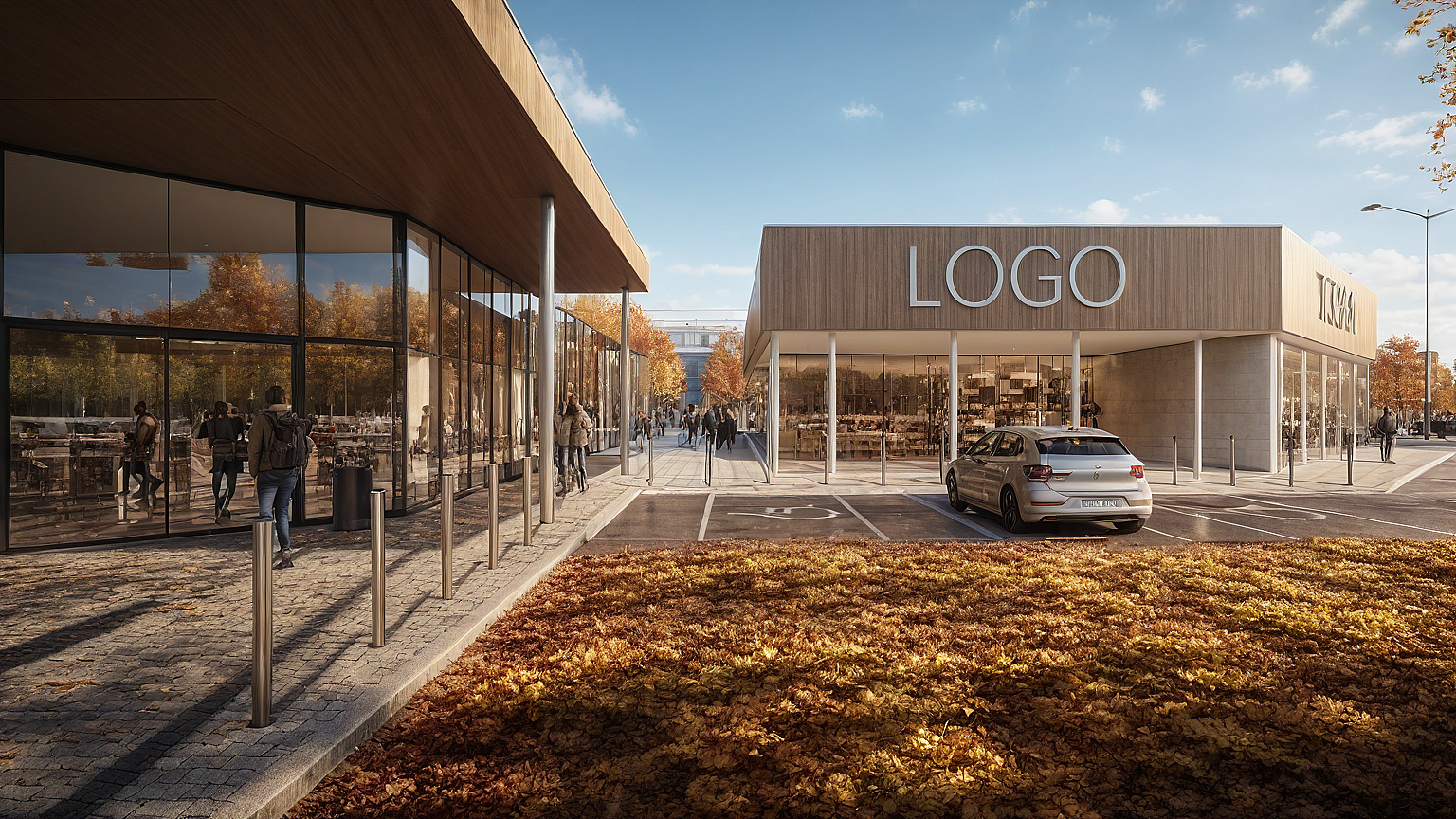 Promptdetailed photo of retail shop, autumn aternoon light, autumn trees, many people visible