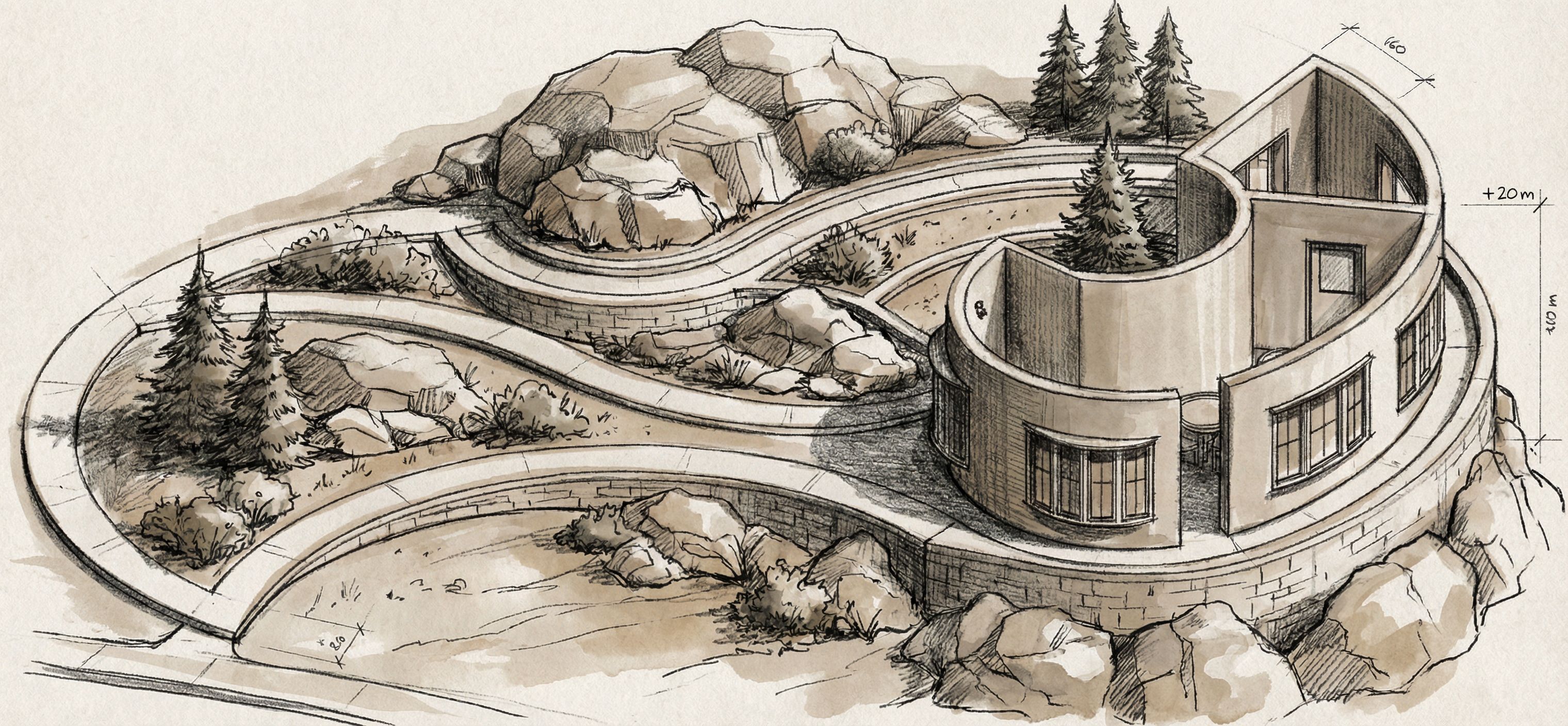 while fully preserving the original site plan and smoothly responding to the gradual slope up to +20 meters THIS IS THE MOST IMPORTANT THING THE BUILDING SHOULD BE +20 M HIGHER THEN STREET. BUILDING SHOULD BE ON TOP OF THE HILLS, keep exact camera angle