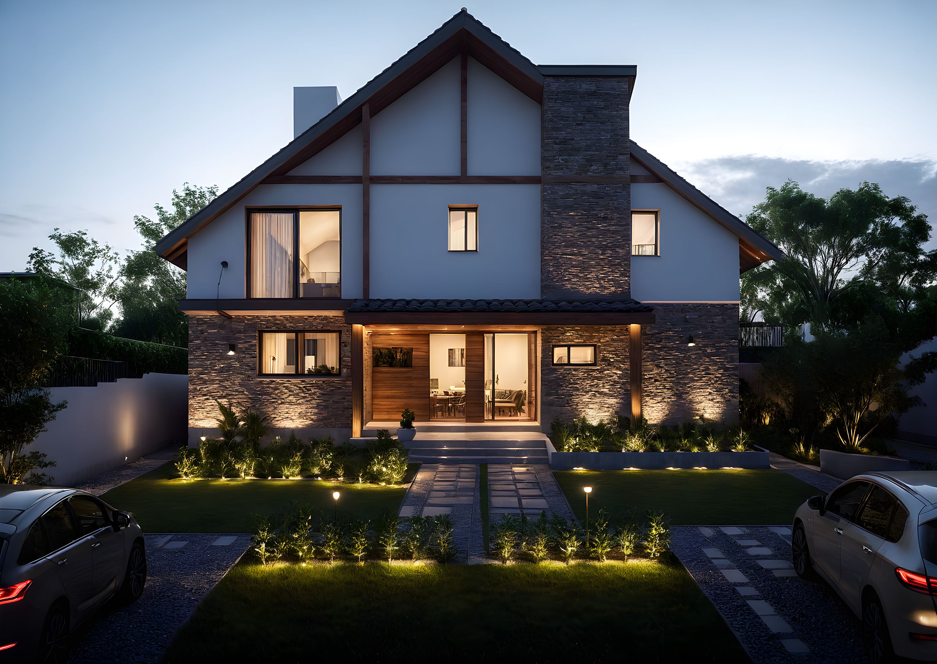 Promptes la fachada de una vivienda tradicional que funciona como consultorio medico y oficina. la fachada esta revestida en ladrillos pintados. el jardin es protagonista. La vista debe ser nocturna. las ventanas tienen persianas de madera a los costados. y la fachada esta iluminada
