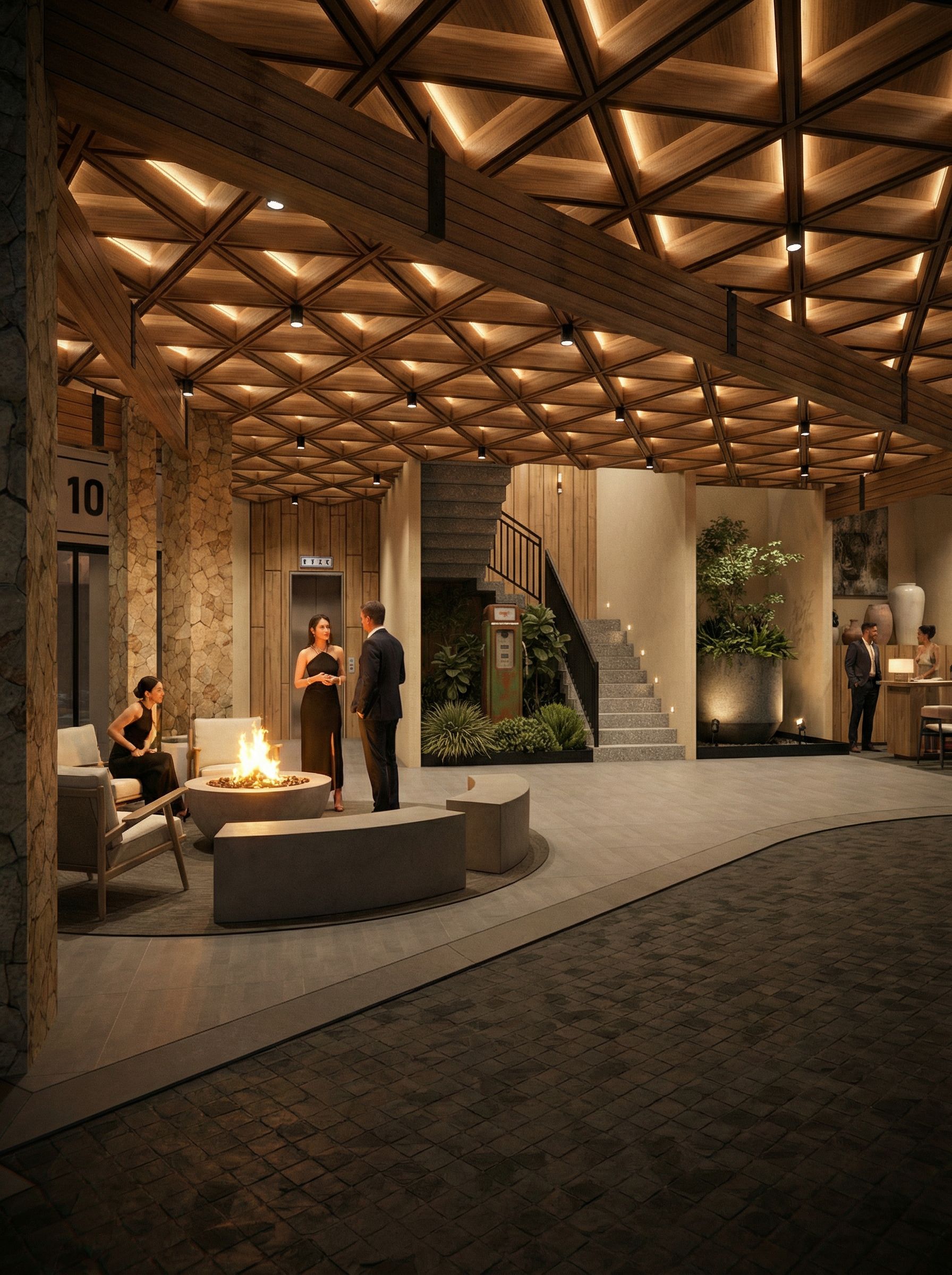 PromptHIGH-END PHOTOREALISTIC RENDERING of a boutique hotel motor lobby, designed to evoke warmth, exclusivity, and a refined sense of arrival. The space features a neutral gray general-purpose tile floor and granite-style stair treads in a 7x30 cm format, with subtle variation and natural texture, carefully scaled as shown in the reference image. Overhead, a natural matte walnut wood ceiling arranged in a precise grid composition adds warmth and craftsmanship, integrated with 10 cm high black tubular light fixtures placed at ceiling intersections, emitting a soft, warm, hospitality-grade glow. Lighting is intimate and layered, enhancing textures and creating a welcoming nighttime ambiance. A large sculptural planter with an aged concrete finish serves as a focal element, containing a mature lush plant with organic, slightly asymmetrical foliage. Next to the staircase, A rusty green gas pump surrounded by local elegant vegetation of San Cristobal reinforces the boutique hotel identity and biophilic design approach. Architectural columns are clad in local San Cristóbal de las Casas flagstone, highlighting regional identity through authentic stone texture, irregular joints, and handcrafted appearance. Matte black metal railings and hardware remain minimal and refined, providing contrast without visual weight. A low-profile fire pit with an aged concrete aesthetic introduces warmth and a subtle sense of luxury, with gentle firelight reflections on surrounding surfaces. Vertical planes are enriched with natural matte walnut wood paneling, adding depth, rhythm, and a sense of artisanal quality. The road surface is finished in stamped concrete, slate pattern, 10x10 cm, slate grey color The rendering should emphasize cinematic composition, soft shadows, global illumination, realistic material response, and ambient occlusion, captured with a wide-angle architectural lens at eye level, ultra-high resolution, and carefully controlled contrast for a timeless boutique hotel atmosphere. Show the entire image area as it was uploaded Minimal, serene, contemplative atmosphere. Architectural silence and refined luxury. Real-world scale. PBR workflow. Leave everything as it is in the image, only leave the area where the gas pump is located with low plants from the region without pots. render the uploaded image exactly as it appears