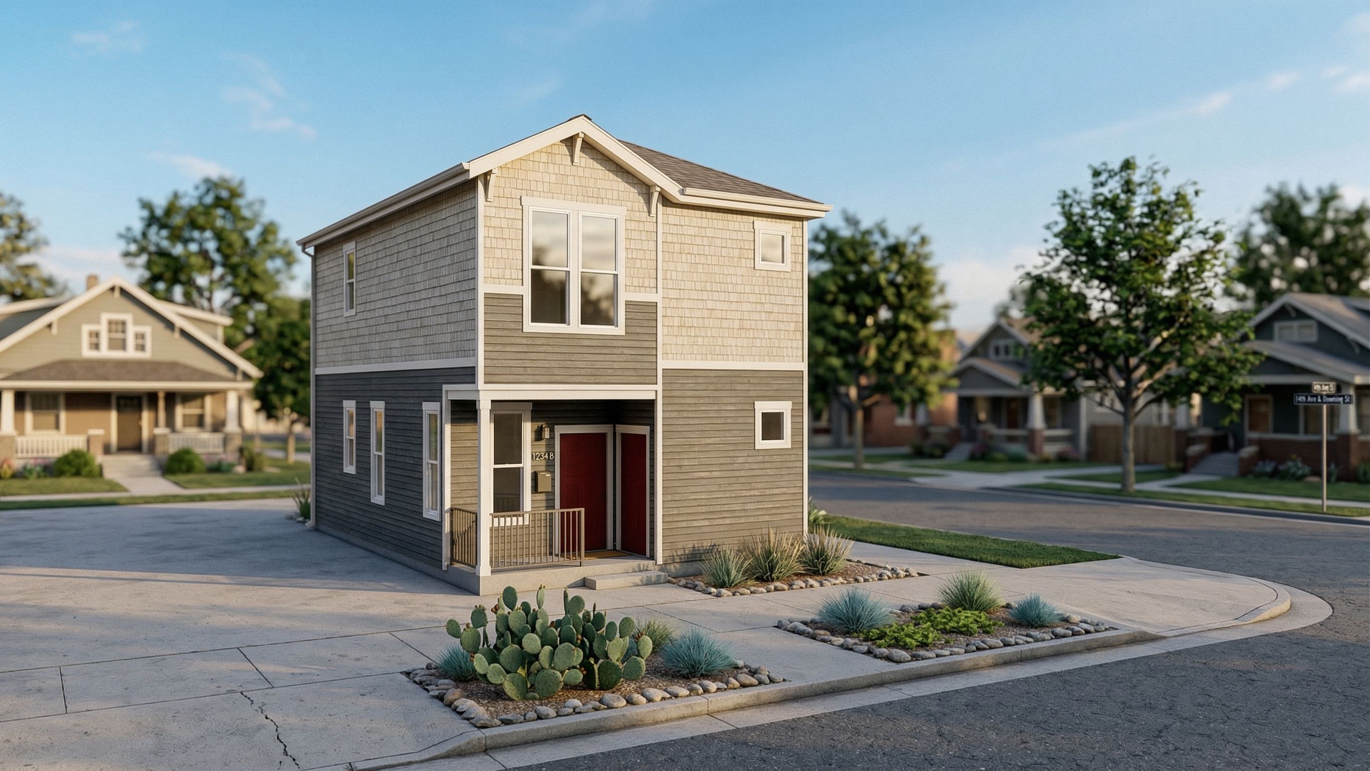 Prompt This will be a 3-dimensional render of an ADU. This ADU will be in Denver Colorado on a street in the city. keep the elevation the exact same as in the image. do not add or change the windows, door, or the roofs. Place minimal consistent landscaping at the front. The main materials will be a what is shown. the extent of the adu is only what is show in the image. do not add extra parts of the house., keep exact camera angle