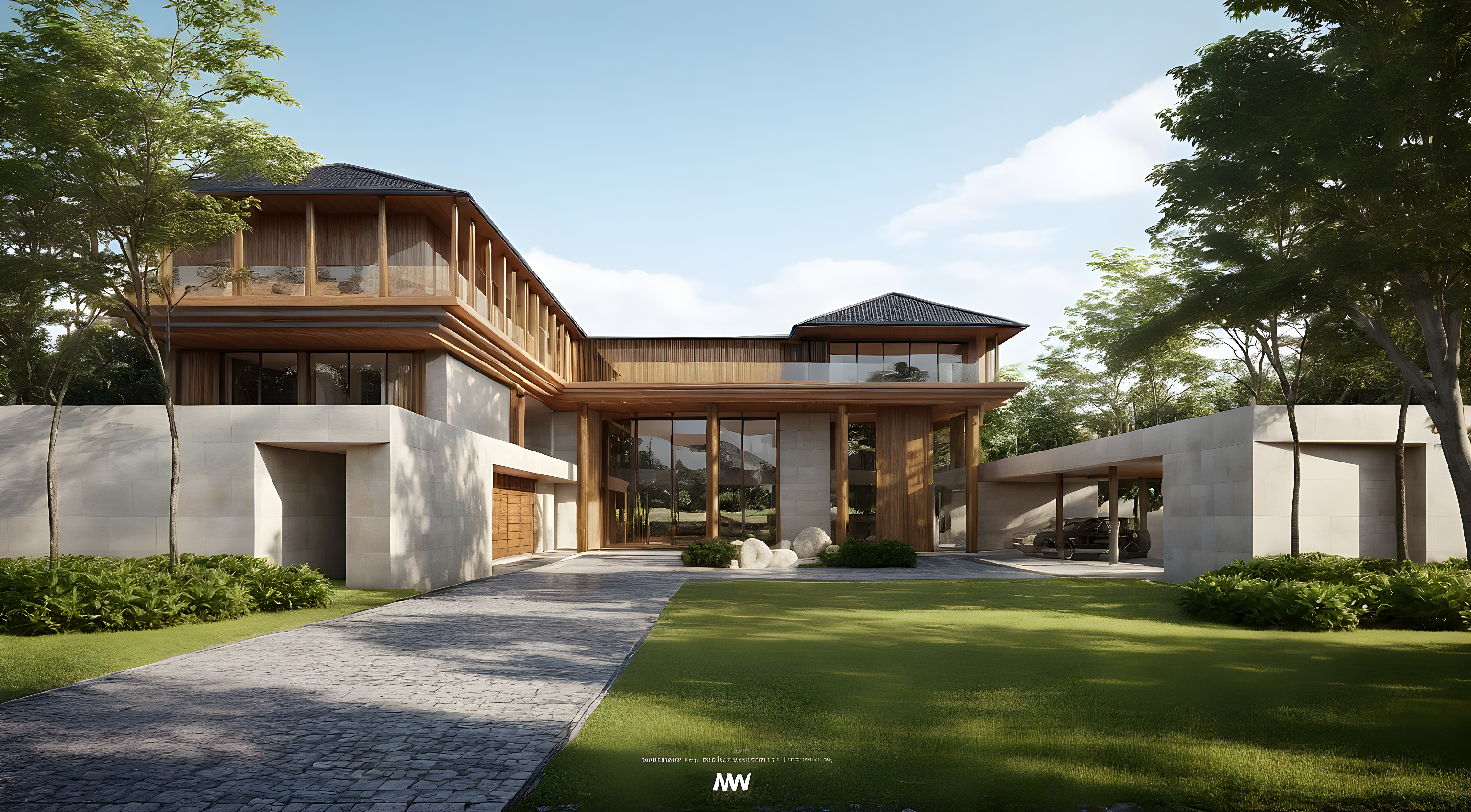 Promptbright day vibrant environment minimal design big teak log column smooth beige limestone tropical garden with grass lawn black cobble stone drive way beautiful tree at the center of turn around
