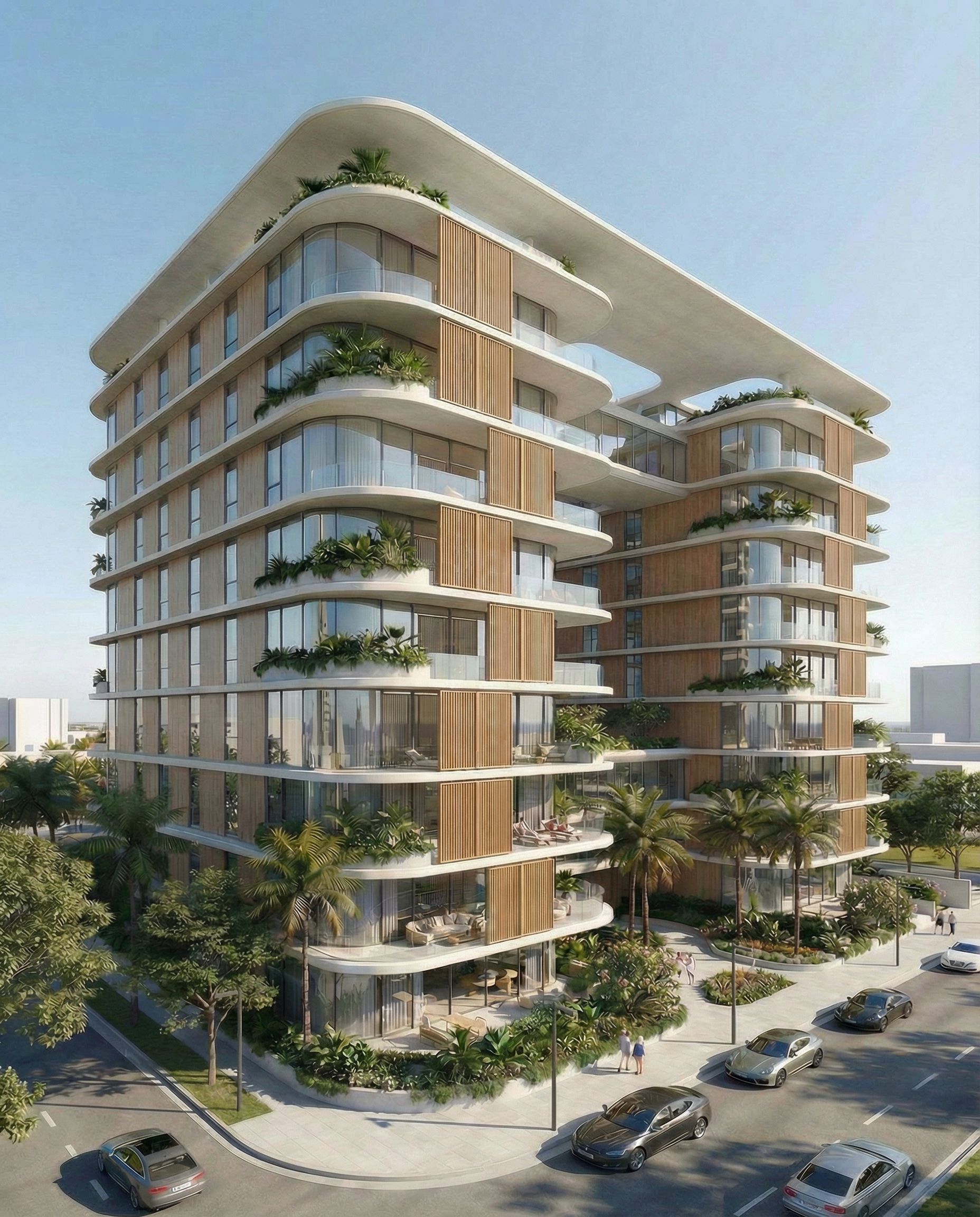 architectural exterior rendering, render this 3D mass into photorealistic rendering, Place a vertical module or two of wood in the front of the buildings, so that it is not all glass, keep exact camera angle, bright daylight, natural lighting, including people, vehicles, greenery and vegetation, high quality, professional, detailed scene