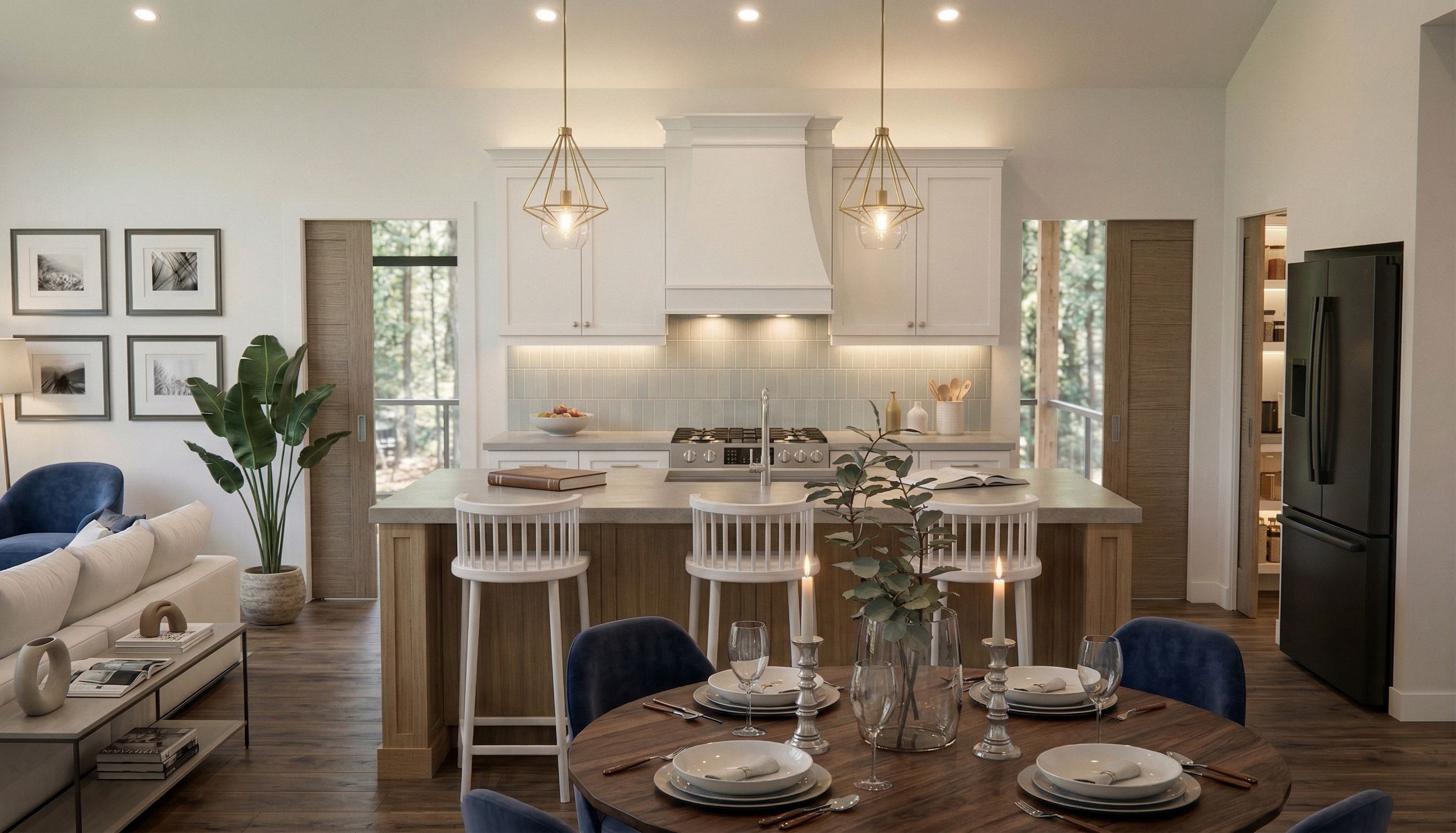 Promptshow half open pocket doors on each side of kitchen, keep exact camera angle