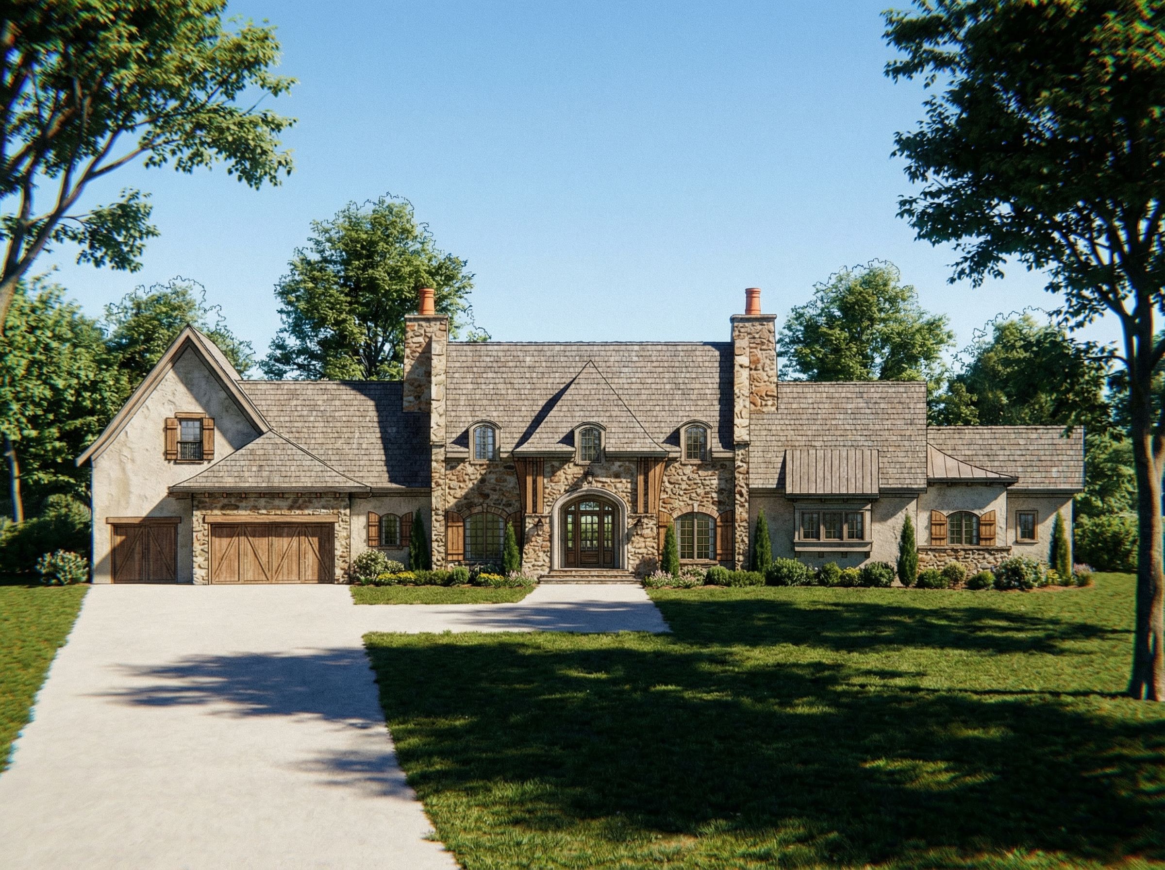 PromptRender this French modern architecture, keep lines as sketched. Rustic stone and stucco walls. Wooden shutters. Rustic wood header accents. Stone chimney with clay chimney pots. Stone parapet walls. , keep exact camera angle