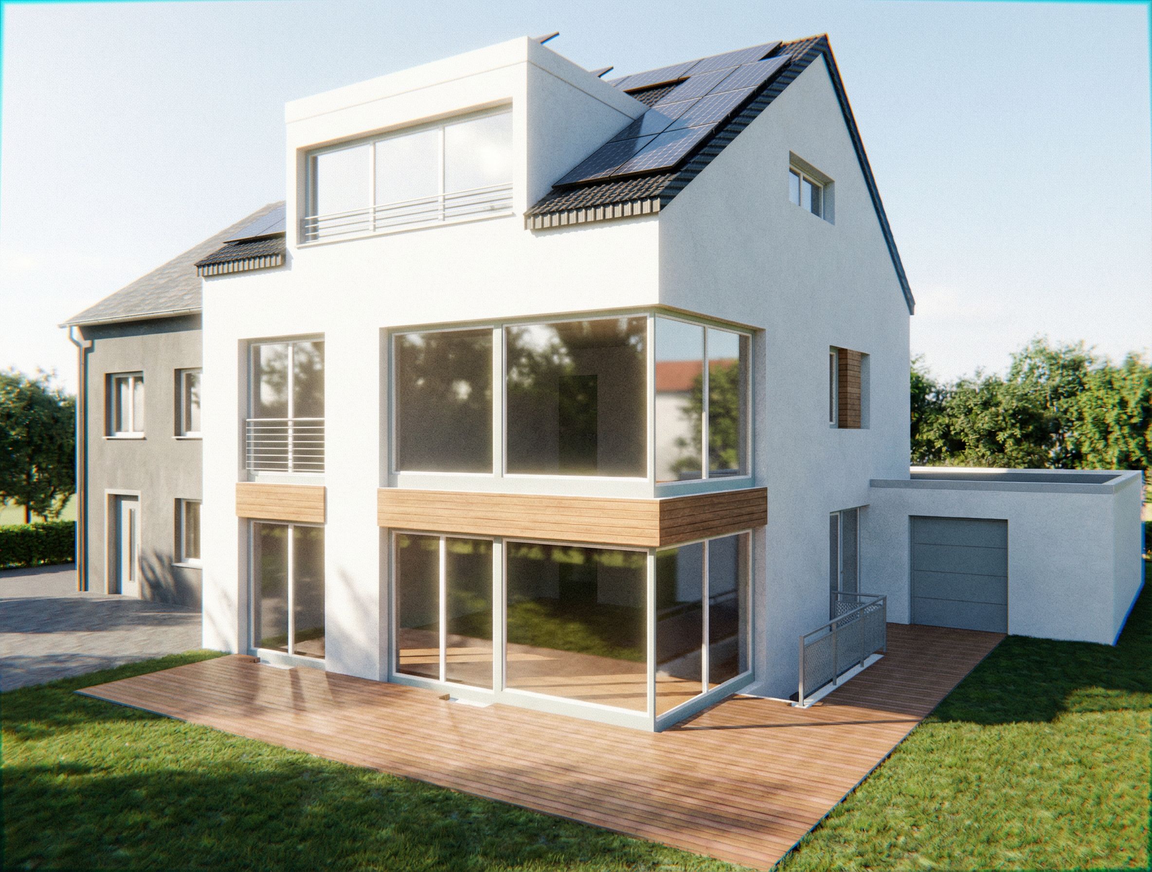 Neubau Neu mit PV auf Dach, Flachdach über Garage-Eingang geschlossen, links Altbau grau, keep exact camera angle