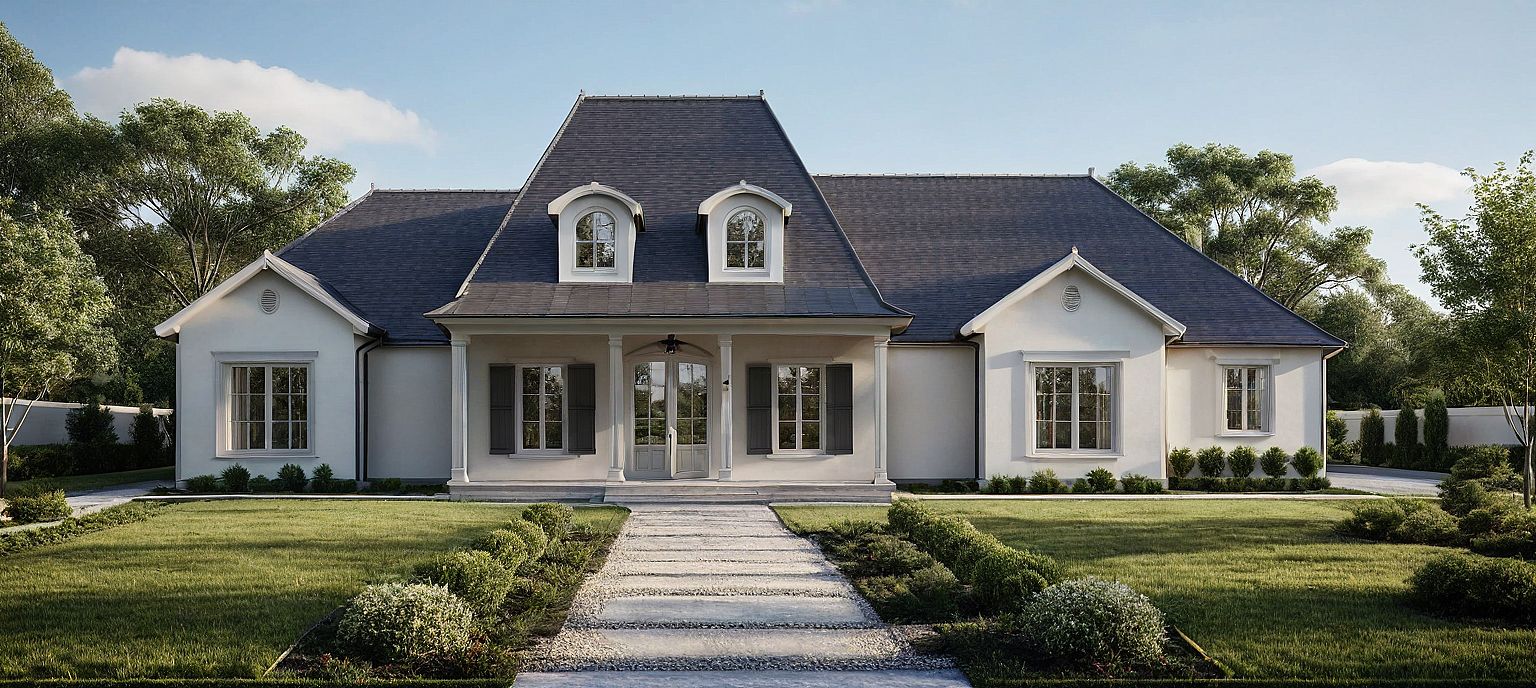 PromptA French Country style, single-story house with a clean, minimalist facade, featuring large floor-to-ceiling windows with full length shutters, facing a landscaped front yard, a hipped roof with a subtle overhang, and a warm, viewed from the street with a well-manicured lawn in the foreground.