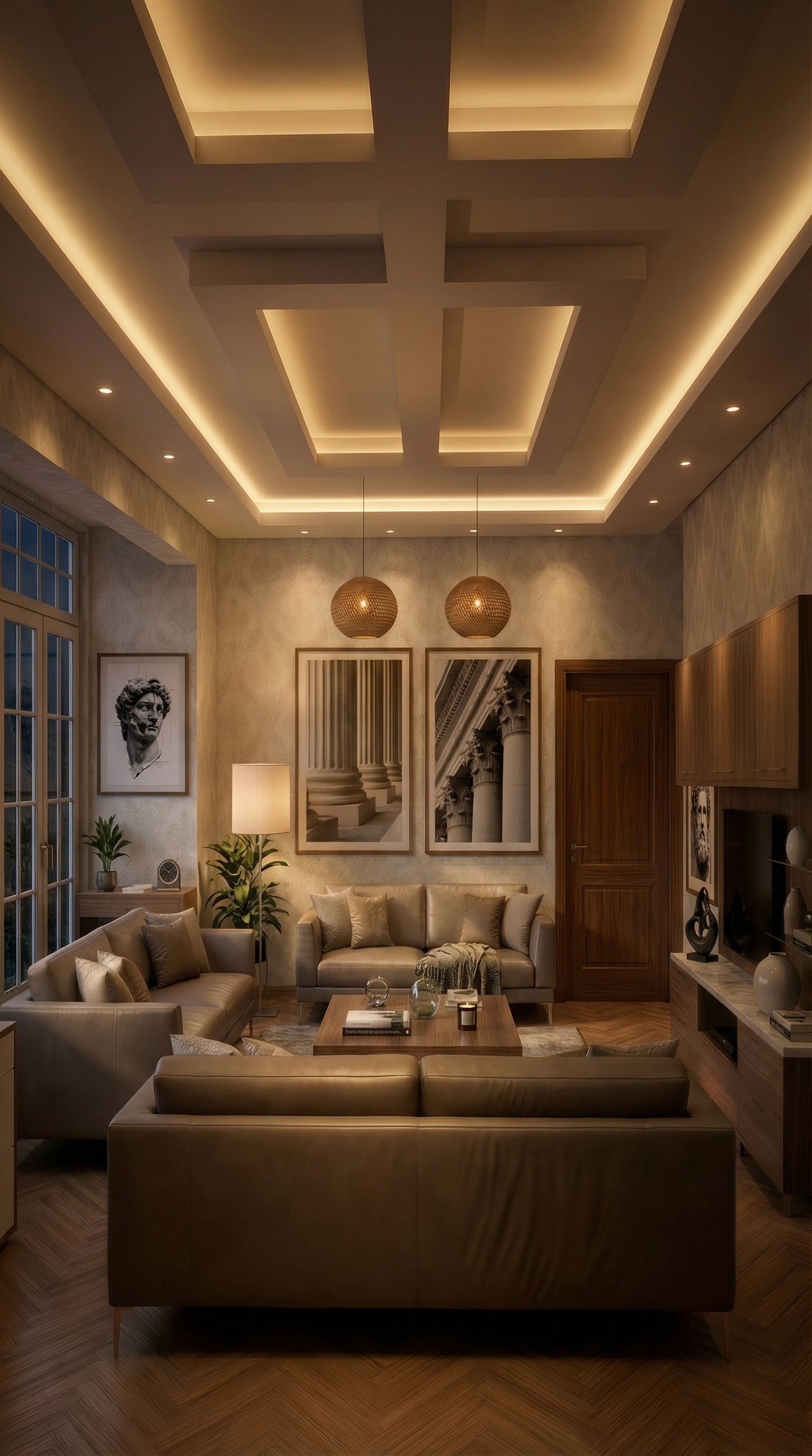 conserva la arquitectura y el diseño de interiores sin modificar la perspectiva ni las dimensiones de ancho x alto y realiza los siguientes cambios sin modificar el tamaño del espacio. Sustituye las ventanas por otras de igual dimensiones pero tipo francesas. añade un cuadro con su marco con la imagen de referencia en la pared izquierda sobre la mesita que está por la ventana la ventana. sustituye el cuadro con colores que está entre la puerta y la televisión y pon un cuadro más pequeño con la imagen de referencia 2, keep exact camera angle