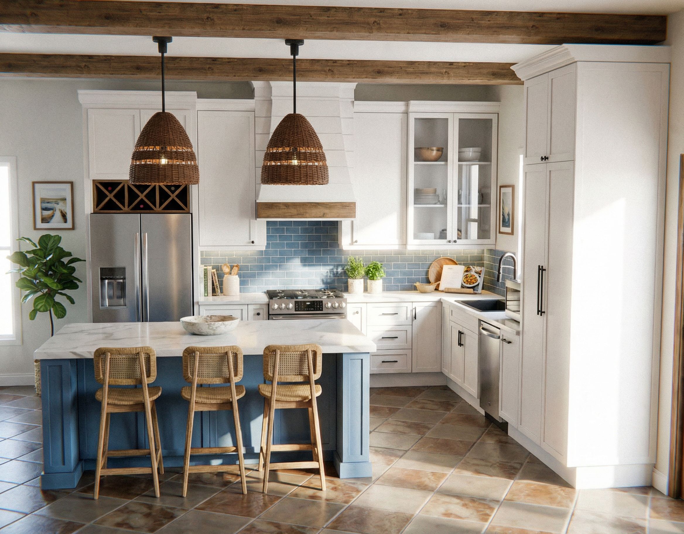Photo of a contemporary kitchen featuring a central island with blue cabinetry, sleek countertops, and stylish wooden accents. The design includes black woven pendant lights, stainless steel appliances, and a tile backsplash in soft blue tones. Set in a modern home environment with earthy flooring and wooden beams overhead, the lighting is natural, illuminating the space during the day. Captured from a slightly elevated angle to emphasize the layout and design intricacies, using a wide-angle lens to enhance depth and perspective. Brown Woven basket ceiling lights, Super bright, full sun room, wood wine rack area, keep exact camera angle