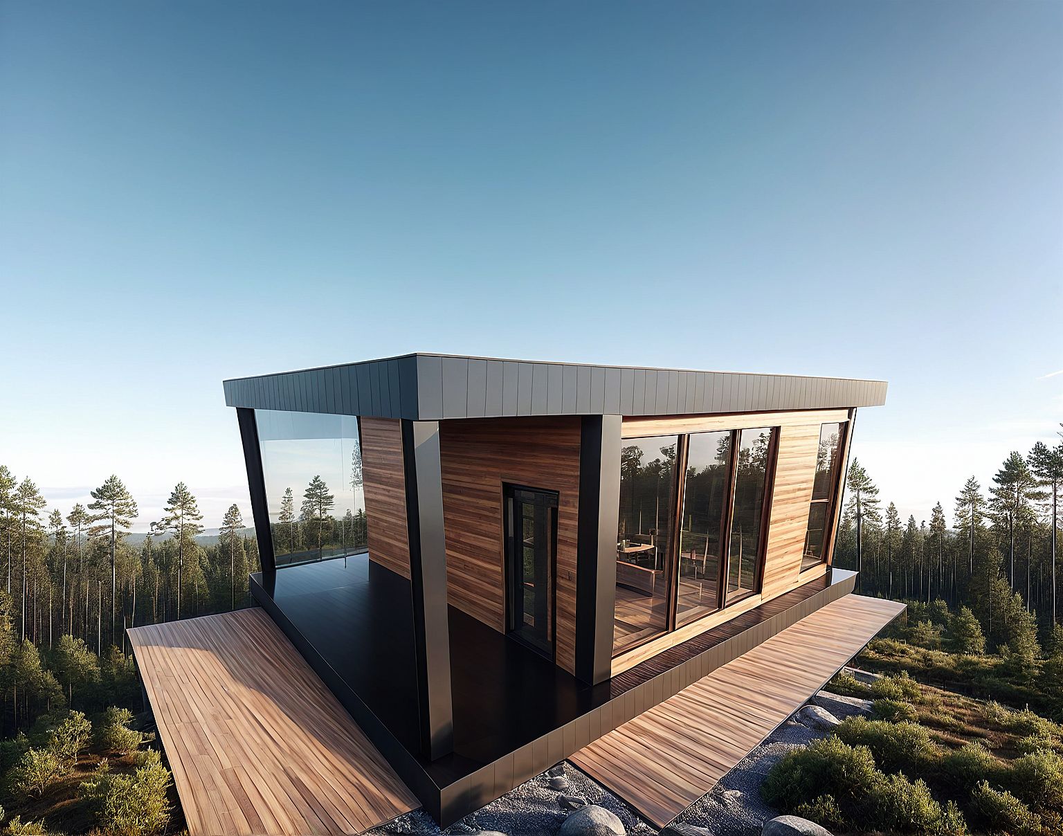 PromptModern minimalist house, wooden panels, glass windows, straight lines, geometric shapes, iron sheets and wooden planks, surrounded by forest.
