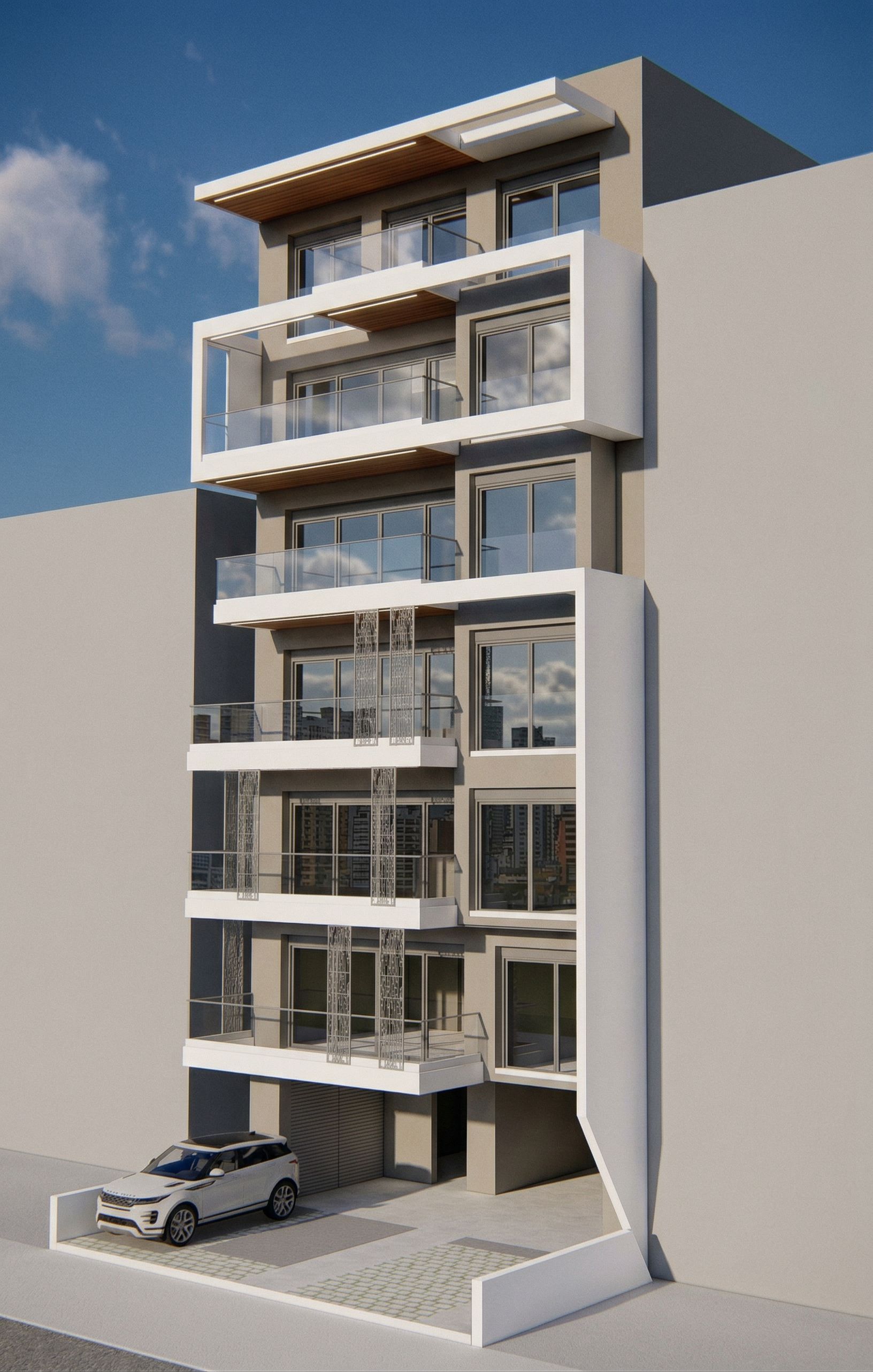 PromptPhoto of a modern apartment building featuring sleek lines and contemporary balconies. Emphasize , expansive glass windows, and wooden tops of balcony accents. Capture natural sunlight enhancing the architectural details, with soft shadows cast by the balconies. Basic color ral 7006 and some beige details with white balconies. Dont change the building. No trees .Do light grey the right and left box. Grammical white Light in the wooden balcony, keep exact camera angle, white balconies, keep exact camera angle