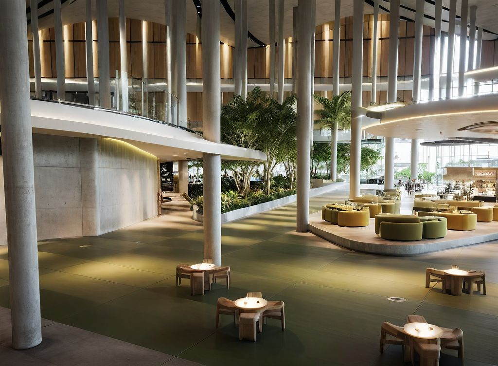 Promptmodern airport lounge, seating area, airport duty free area, shops area , landscape garden, two levels building, organic ceilings, concrete columns, soft whites (60%) olive greens (30%) soft yellows (10%) color palette, natural daylight, realistic results, high quality materials, daytime sky mode.