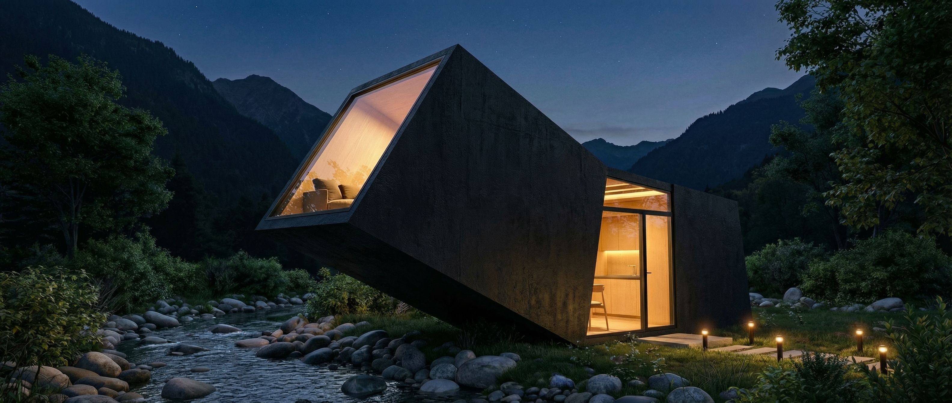 Promptarchitectural exterior rendering, render this photo into photorealistic rendering, a very exclusive holiday tiny house, covered in natural textures, a small river environment, in the mountains, Evening cozy atmosphere, cozy lights inside. some small lights outside towards the entrance. MAke it in the summer. do not turn the angle, make all the facade black in concrete texture. no grass on it. in the left side of the image, take out the trees and put a nice sky , keep exact camera angle, night scene with ambient lighting, high quality, professional, detailed scene
