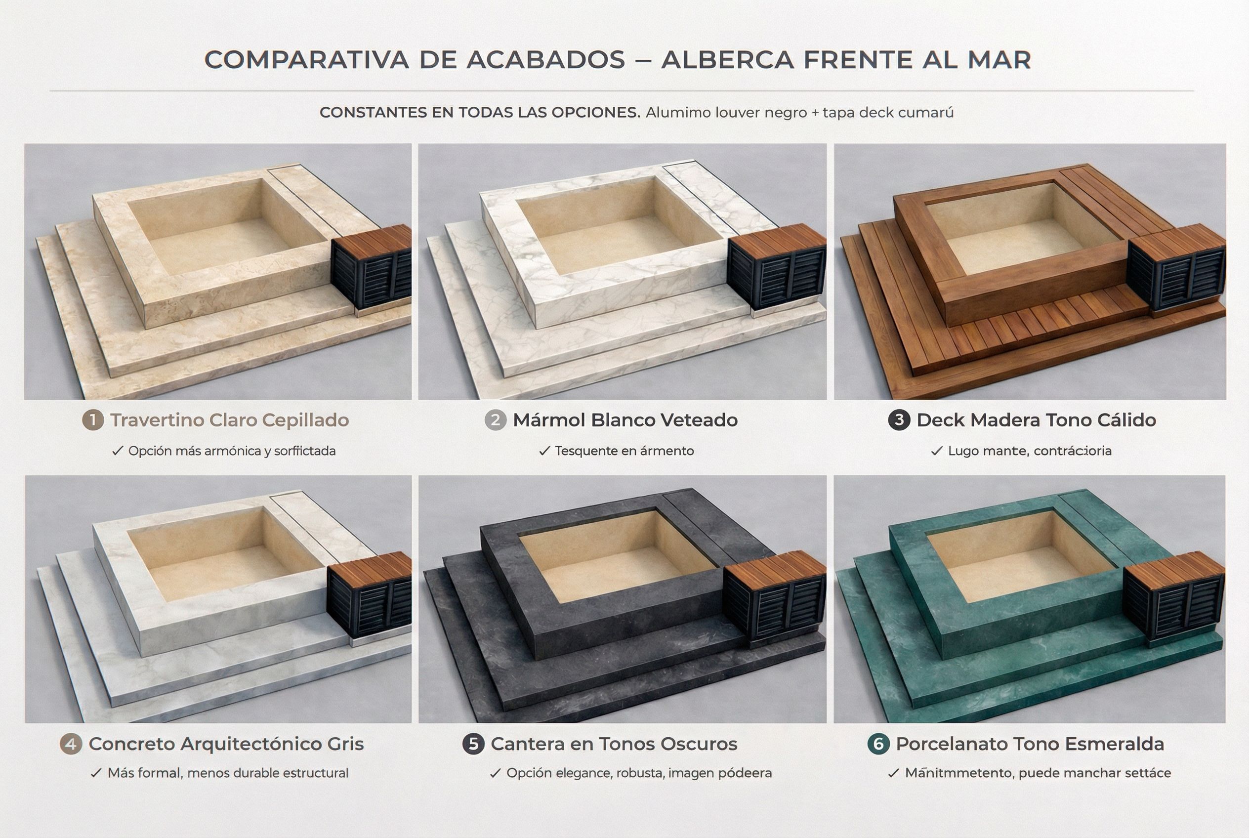 Maintain the image exactly as it currently appears. Do NOT modify: Any geometry Any dimensions or proportions Camera angle or framing Lighting or shadows Exterior materials of each proposal Black aluminum louver elements CumarĂº wood deck top Graphic layout, text, or composition Surface textures outside the pool interior The only permitted modification is inside the pool basin. Required correction: For all six models 1 through 6: The internal vertical walls of the pool must match exactly the same tone as the pool floor. The finish must be light sand Chukum. The interior walls + floor must appear as one continuous, uniform, monolithic surface. No color variation between walls and floor. No added texture changes beyond matching the existing Chukum tone. Do not alter reflections, perspective, or external perimeter finishes. The intervention must be limited strictly to the internal basin walls. No new elements. No material reinterpretation. No aesthetic enhancement. No design modification. Photorealistic rendering. Preserve all original design intent and composition., keep exact camera angle