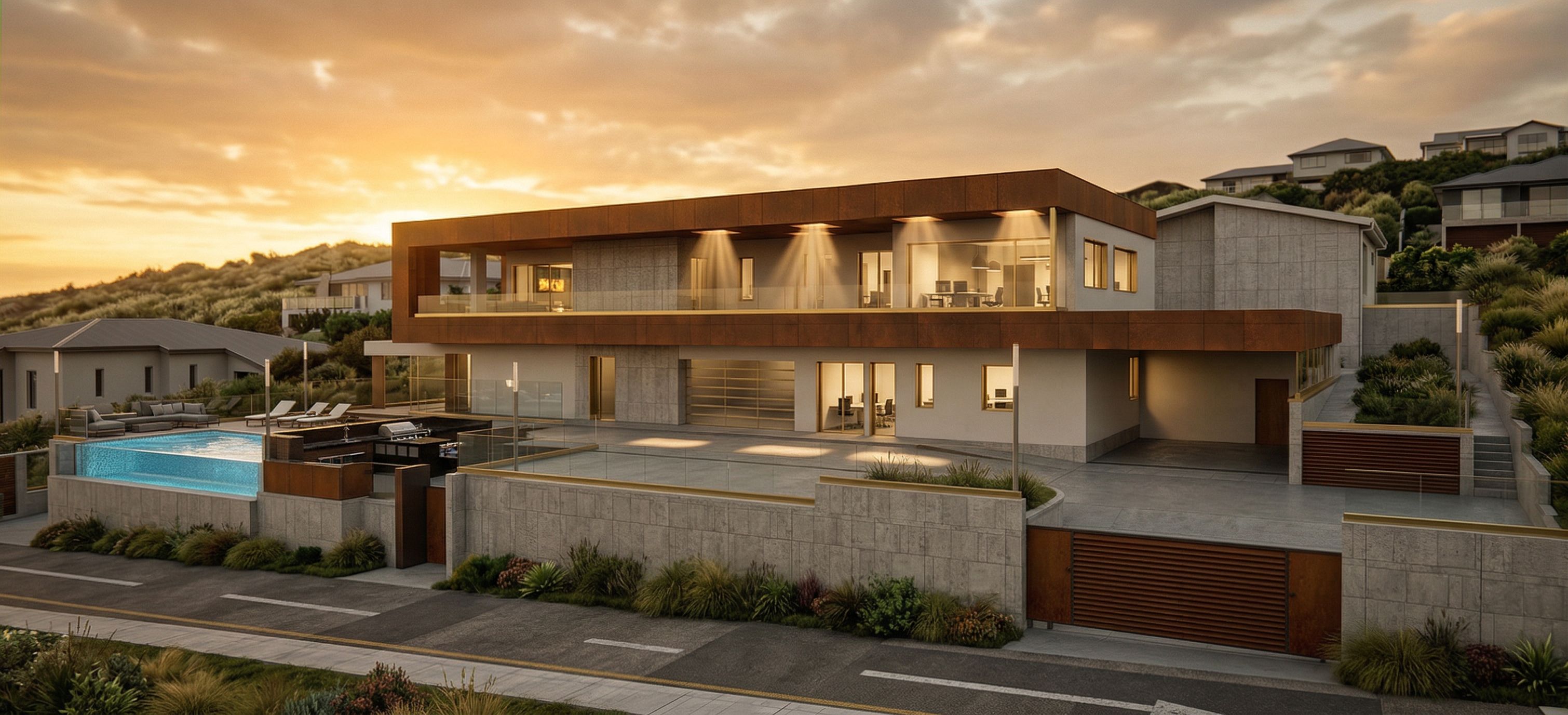 PromptCreate a highly photorealistic, high-resolution image. Use the materials shown in the "reference image1". There are Corten-effect Alucobond panels; light-colored plaster; glass parapets with a brass-colored aluminum profile underneath; the thin window and French window frames are brass; the volume in the center of the building, visible on the ground and first floors, is clad in concrete-effect tiles. The exterior flooring is industrial concrete; the exterior walls are clad in the same concrete-effect tiles as the building; the horizontally slatted doors seen at the bottom right are made of Corten panels, identical to the Corten cladding of the building; on the first-floor balcony ceiling, there are dark, square-shaped areas, which are square holes that allow light to penetrate from the sky to the first-floor balcony; it shows volumetric rays of light passing through these square holes. The transparent light blue parts are made of clear glass., keep exact camera angle, keep exact camera angle