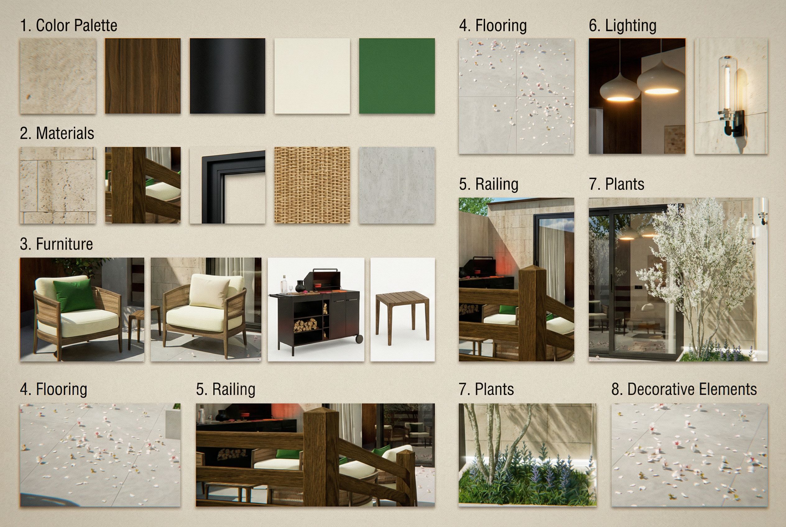 PromptUsing the attached image of the terrace, create a mood board strictly based on the existing design. Extract the color palette, materials, furniture, flooring, railing, lighting, plants, and decorative elements exactly as they appear in the image. Do not add or alter any elements. Present the mood board in a visually organized layout for easy reference.”, keep exact camera angle