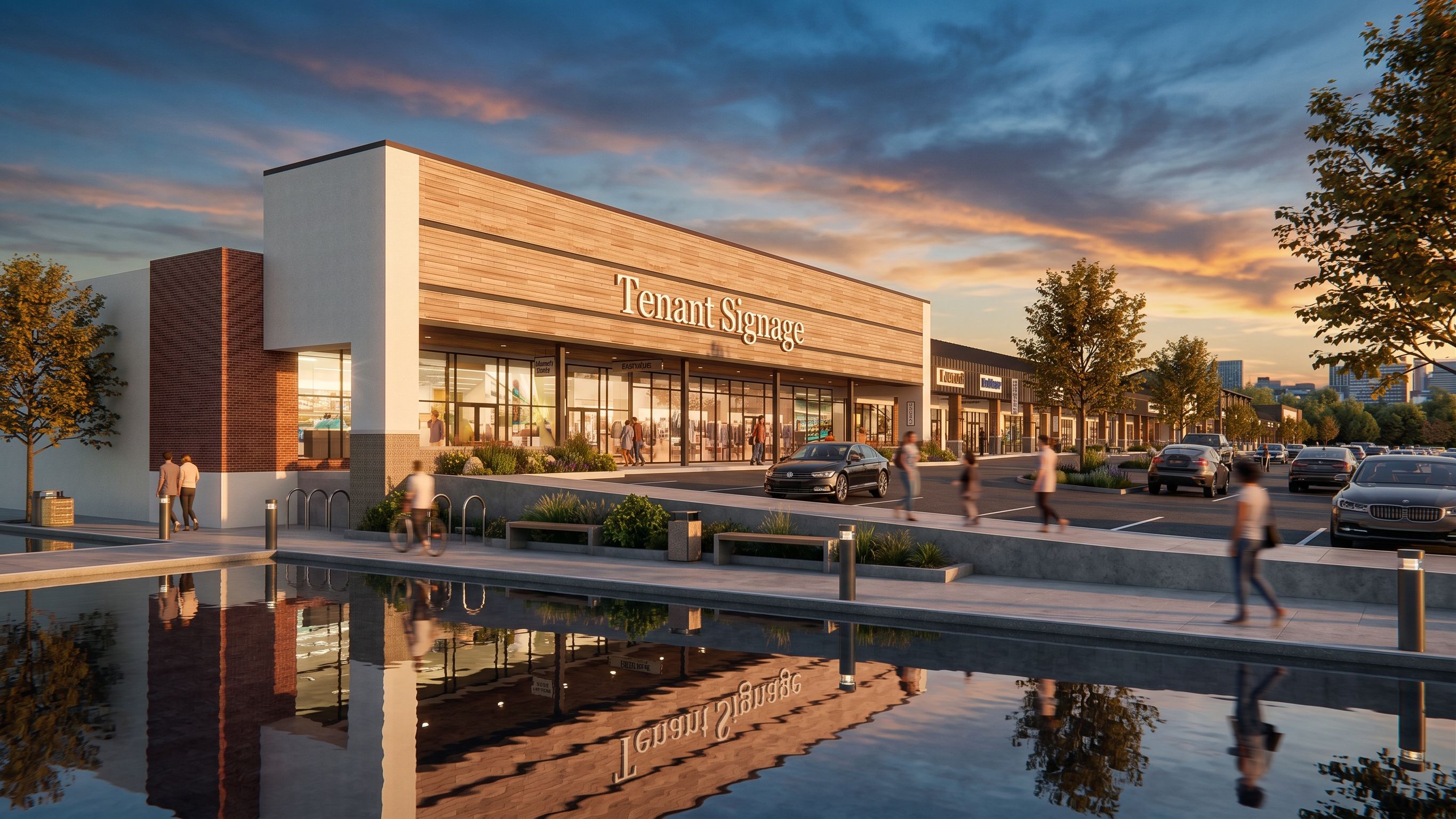 PromptPhoto of a modern retail building, featuring a combination of natural wood, brick, and glass facades. The design showcases large storefront windows, inviting signage, and landscaped planters. Set in an urban environment, with nearby parking and pedestrian areas, the scene is bustling with shoppers. Golden hour lighting casts warm tones, highlighting textures and creating soft shadows. Captured from a low angle, focusing on the entryway and surroundings, simulating a wide-angle lens perspective for dynamic depth and scale. Keep camera angle as is., keep exact camera angle