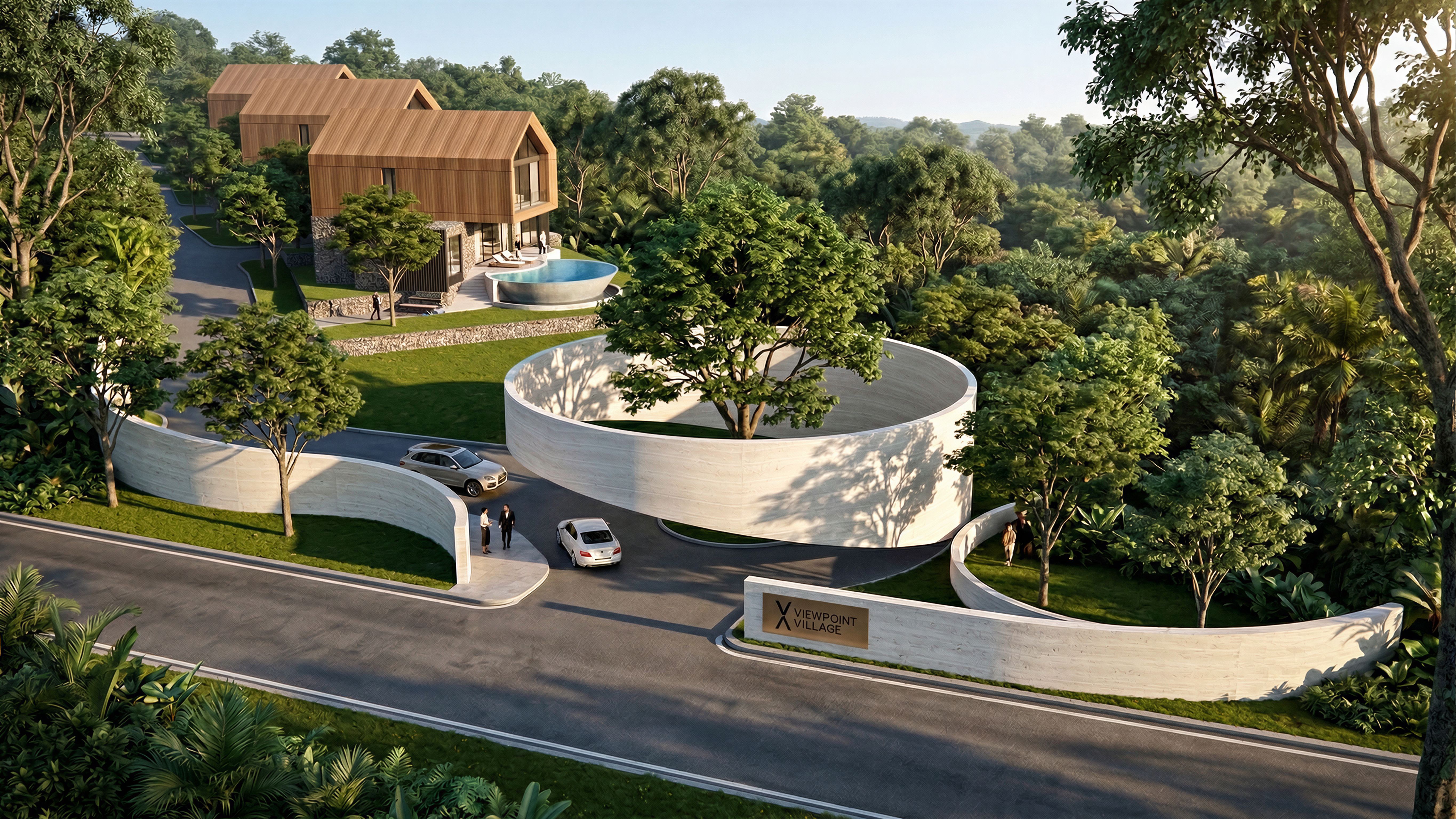 Gate and signage located in Khao Yai. The architectural style is Tropical Minimal. The design features massive, elegantly curved walls clad in honed White Travertine stone. Above the entrance, a sophisticated floating ring structure creates a dramatic sense of arrival and space over a driving roundabout. At the center of the roundabout is a large, beautifully formed, mature tropical tree. Cinematic morning sunlight grazes across the textured, curved travertine surfaces, casting intricate shadows of the tree leaves onto the stone. On the lower section of the curved wall is the project signage with the name and logo following Reference image 1 with Bronze material. The overall atmosphere is lush and shady, surrounded by large mature trees and tropical foliage, with leaves sparkling in the morning light. Do not change or add design. Please turn Google maps background into the realistic environment, do not include symbols or text of Google maps., keep exact camera angle, keep exact camera angle