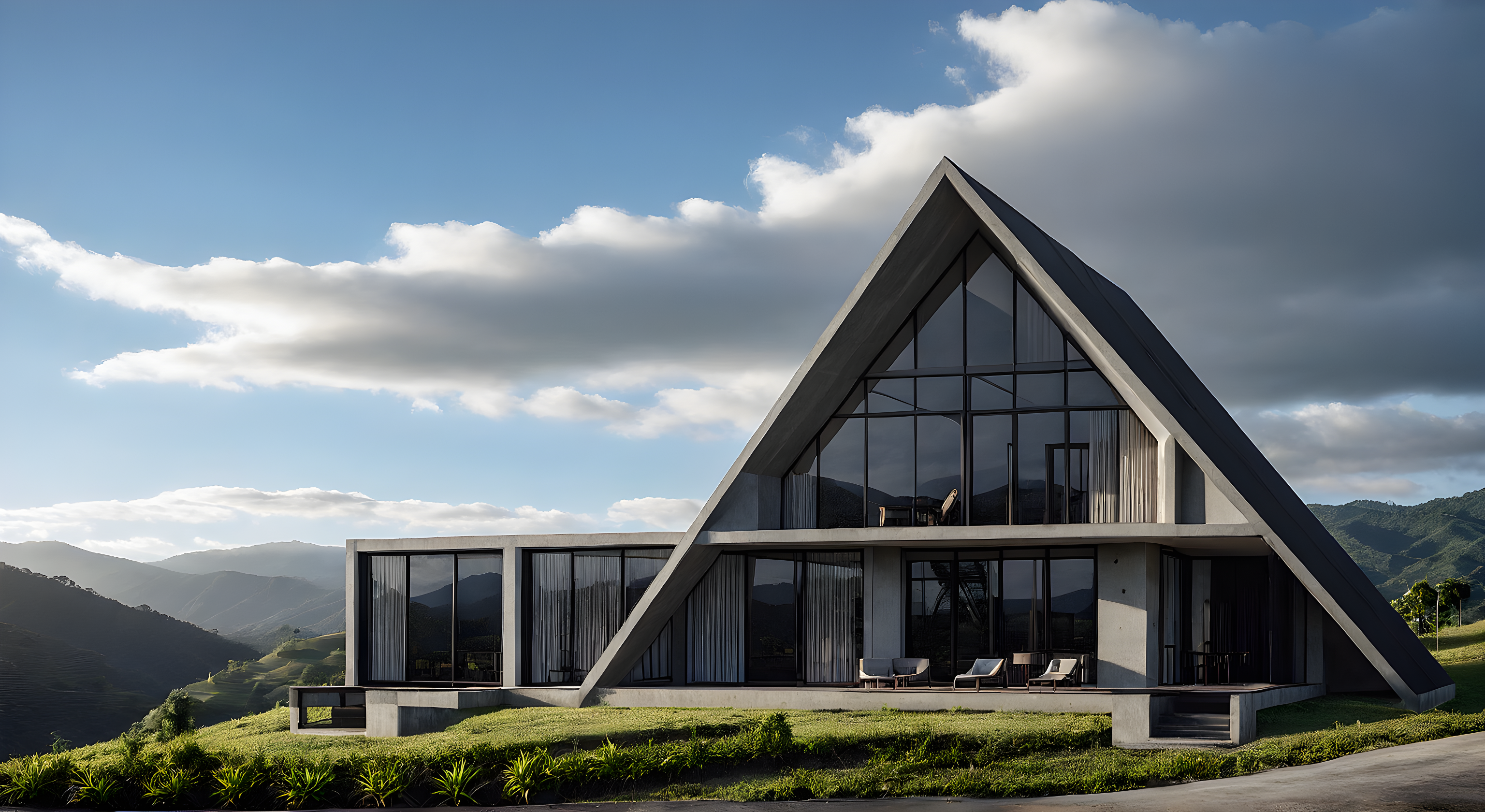 PromptModer Concrete Village, Mountains Terrain in Jarabacoa, Black Matte Windows Profile, Afternoon View, Curtains Behinds Windows.