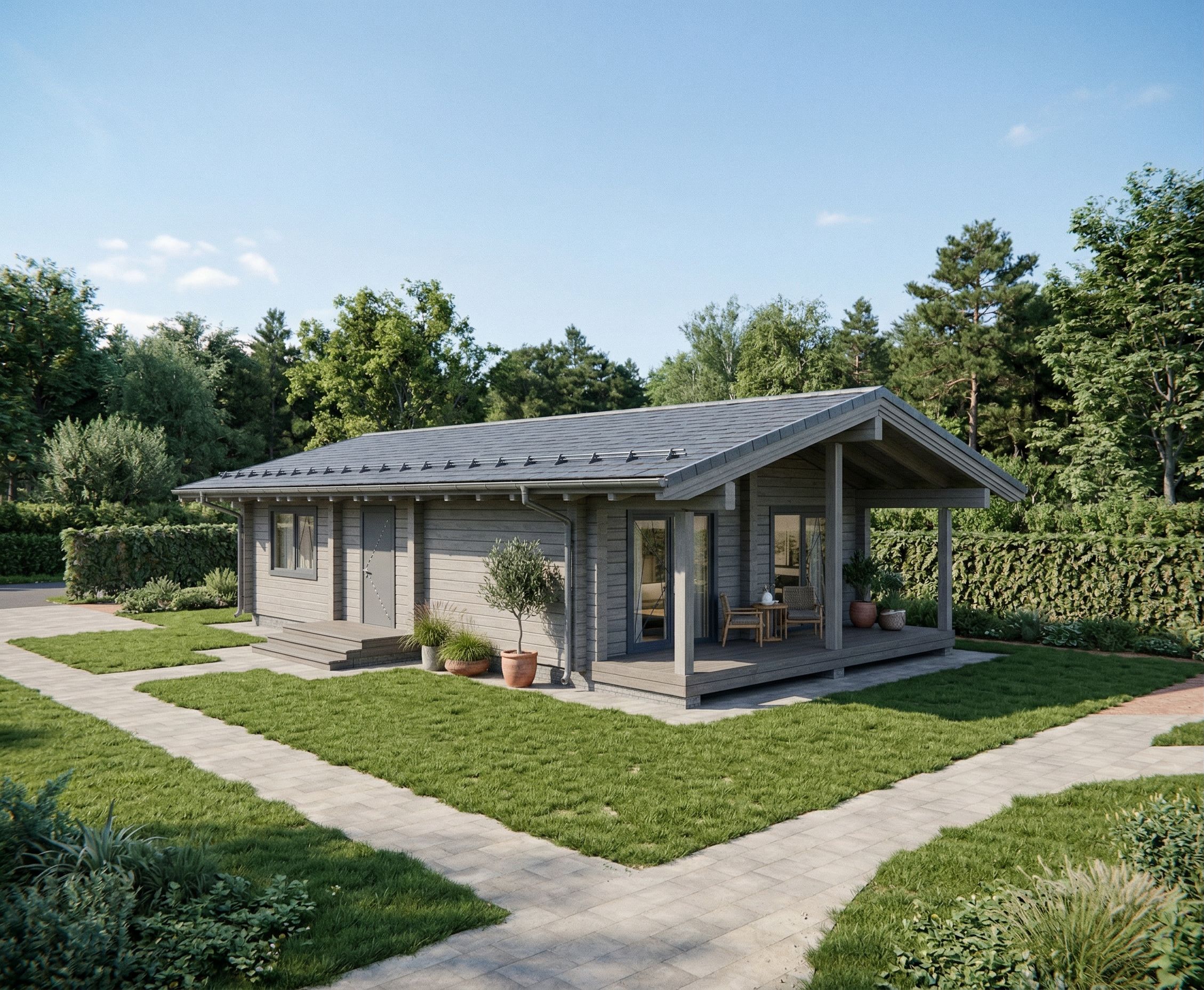 the house is made of grey laminated timber, keep exact camera angle