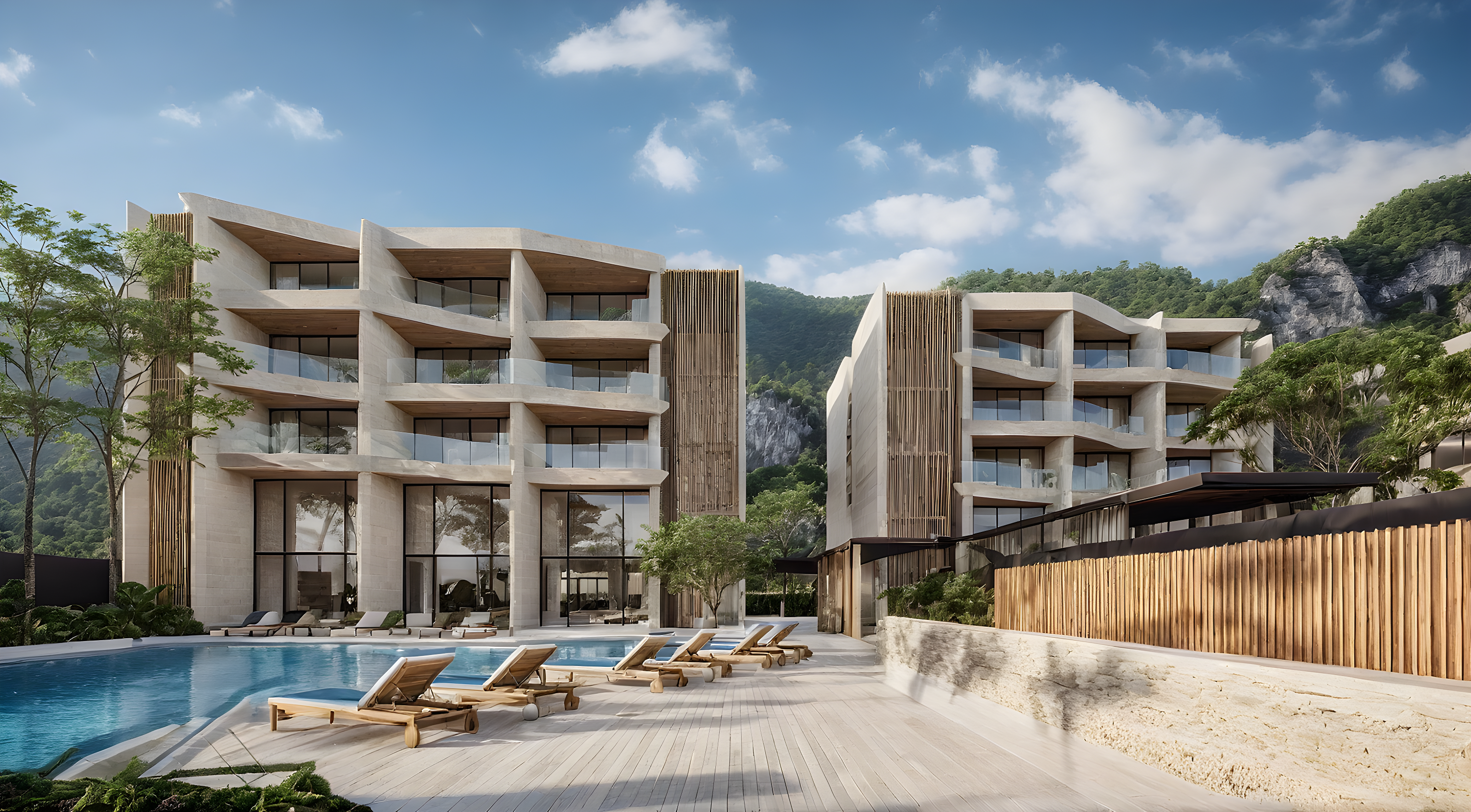 layered mountains view lush greenery environment vibrant mood bright sunny day blue sky keep smooth corner building line overflow edge swimming pool smooth beige limestone keep wooden louvre facade with modern details weathered wooden terracesun lounger on terrace