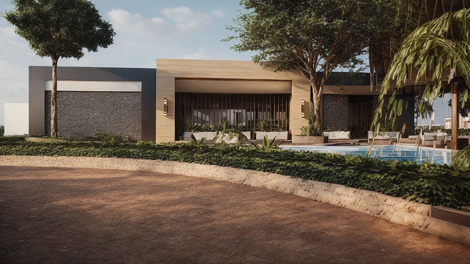 create a high-end image, very tidy around of this new hotel in Kampala context. maintain the image angle. place some people in the context