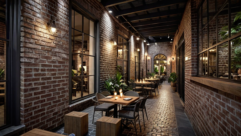 PromptOutdoor seating area for Jamaican Restaurant, exposed worn brick, dark random pattern pavers, some landscape and performance stage at the end of the hall