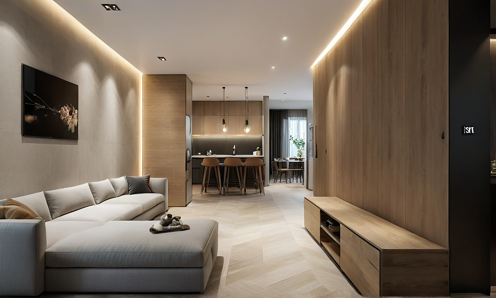 Prompt1. minimalistic style 2.tiles on the floor in the kitchen 3.in living room i want to have dining table and coffe table and sofa and tv on the wall