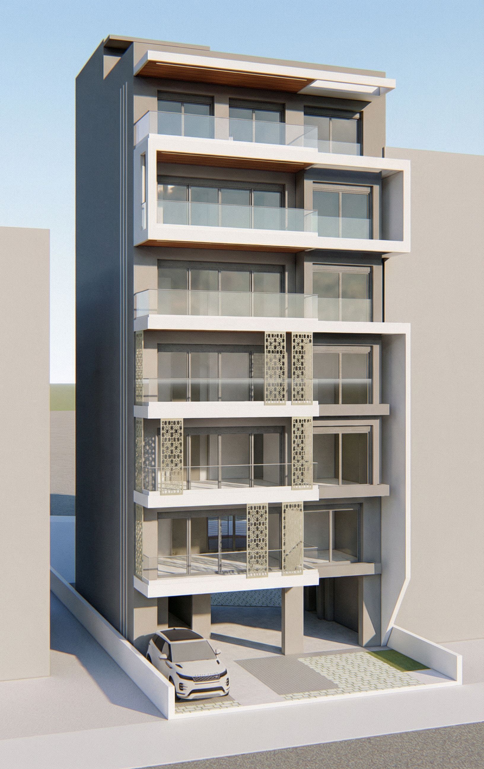 PromptPhoto of a modern apartment building featuring sleek lines and contemporary balconies. Emphasize , expansive glass windows, and wooden tops of balcony accents. Capture natural sunlight enhancing the architectural details, with soft shadows cast by the balconies. Basic color ral 7006 and some beige details with white balconies. Dont change the building. No trees .Do light grey the right and left box, keep exact camera angle