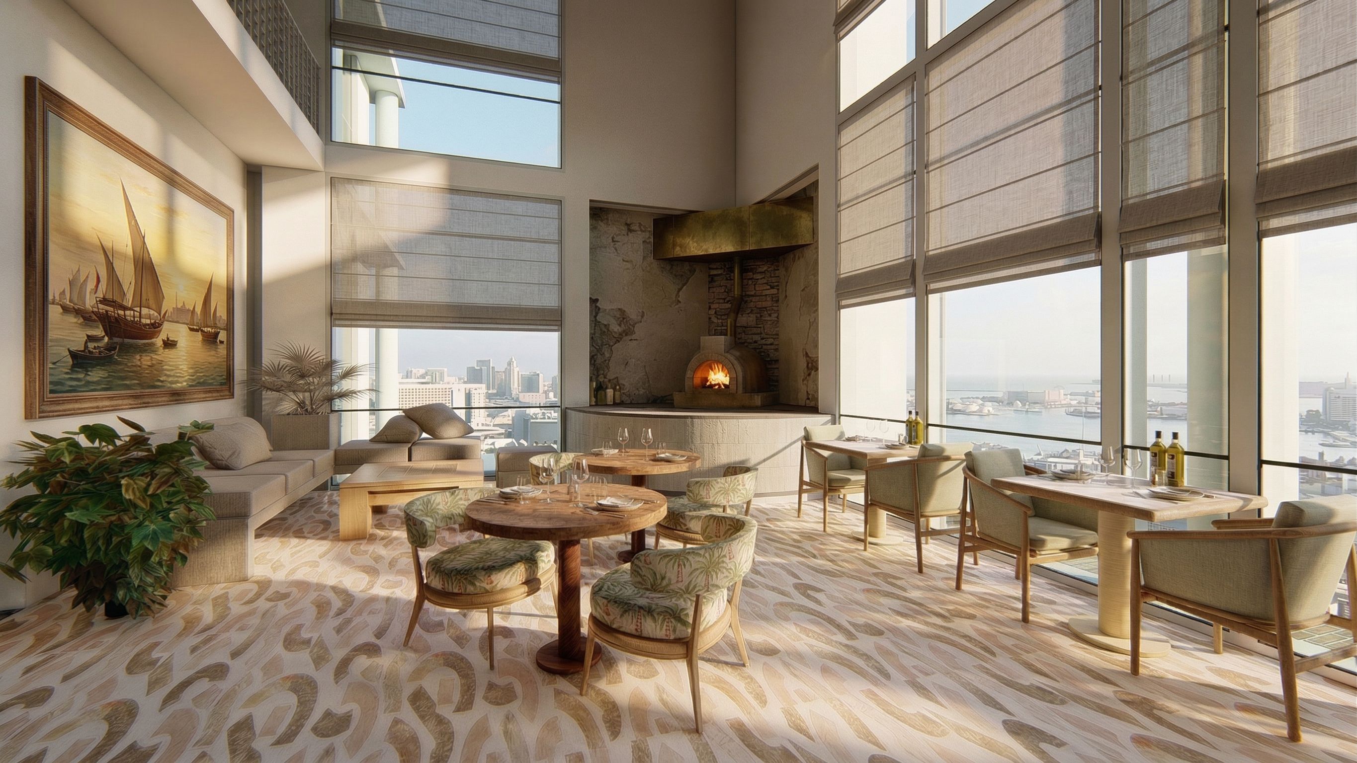 PromptChange the painting to the left to Bahrain ship painting, keep exact camera angle