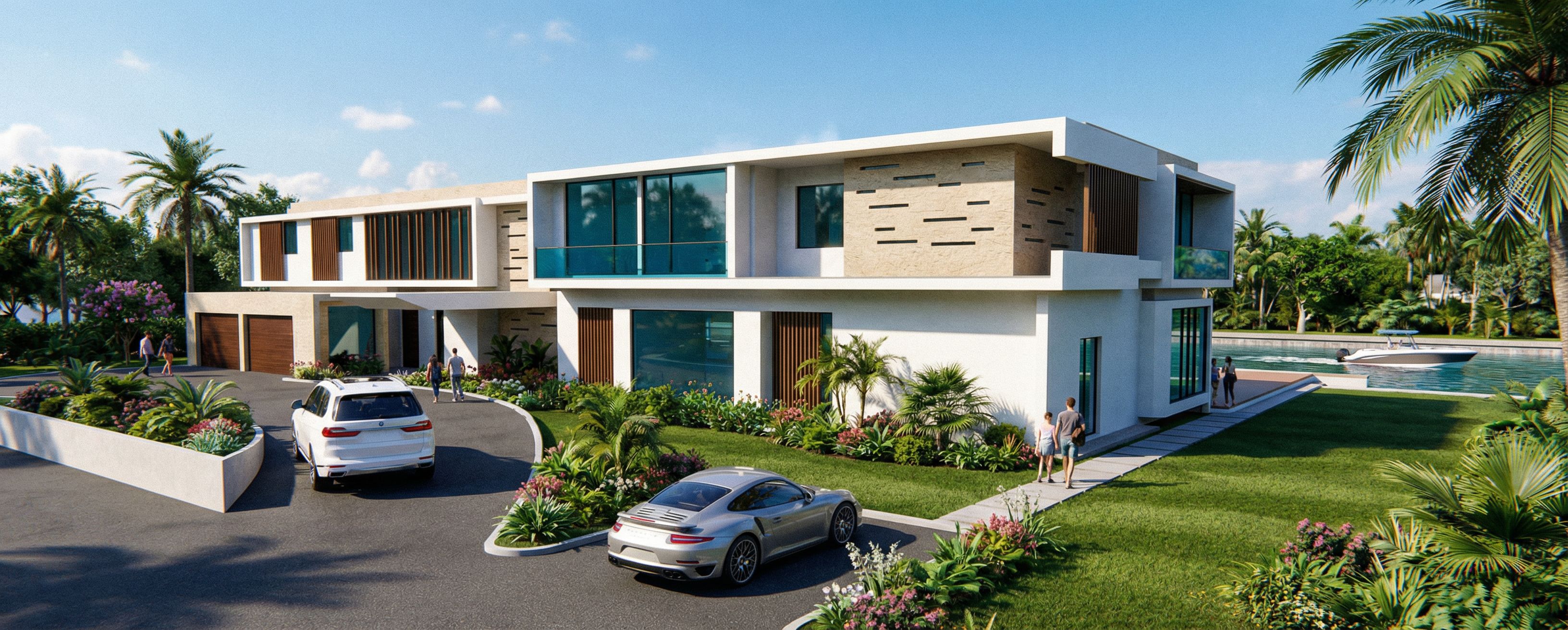 CIELO CLARO CON ALGUNAS NUVES. VEGETACION TIPICA DE LA FLORIDA. MOSTRAR BELLOS JARDINES. MOSTRAR UN CANAL ATRAS DE LA CASA CON UN BOTE PASANDO. PERSOMNAS CAMINANDO. ILUMINACION BASTANTE TENUE DENTOR DE LA CASA. MOSTRAR UNA BMW X7 BLANCA Y UN PORSCHE 911 CARRERA EN EL FRENTE DEL GARAGE, keep exact camera angle