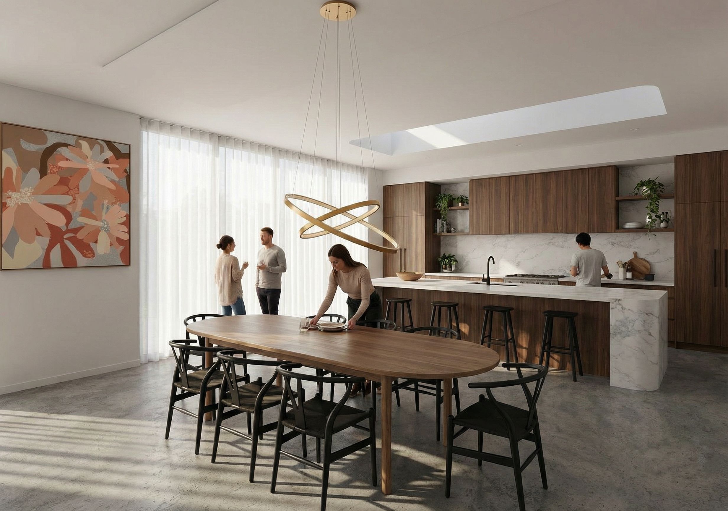 Promptinterior design rendering, render this 3D mass into photorealistic rendering, Photo of a modern kitchen dining area featuring an elongated wooden table surrounded by black chairs. Highlights include sleek cabinetry with marble countertops, a statement pendant light above, and a subtle floral artwork on the wall. Ambient natural light filters through sheer curtains, creating soft shadows across the textured gray flooring. Captured from a corner angle with a wide lens to emphasize depth, showcasing the harmony between functional design and contemporary aesthetics., keep exact camera angle, including people, high quality, professional, detailed scene