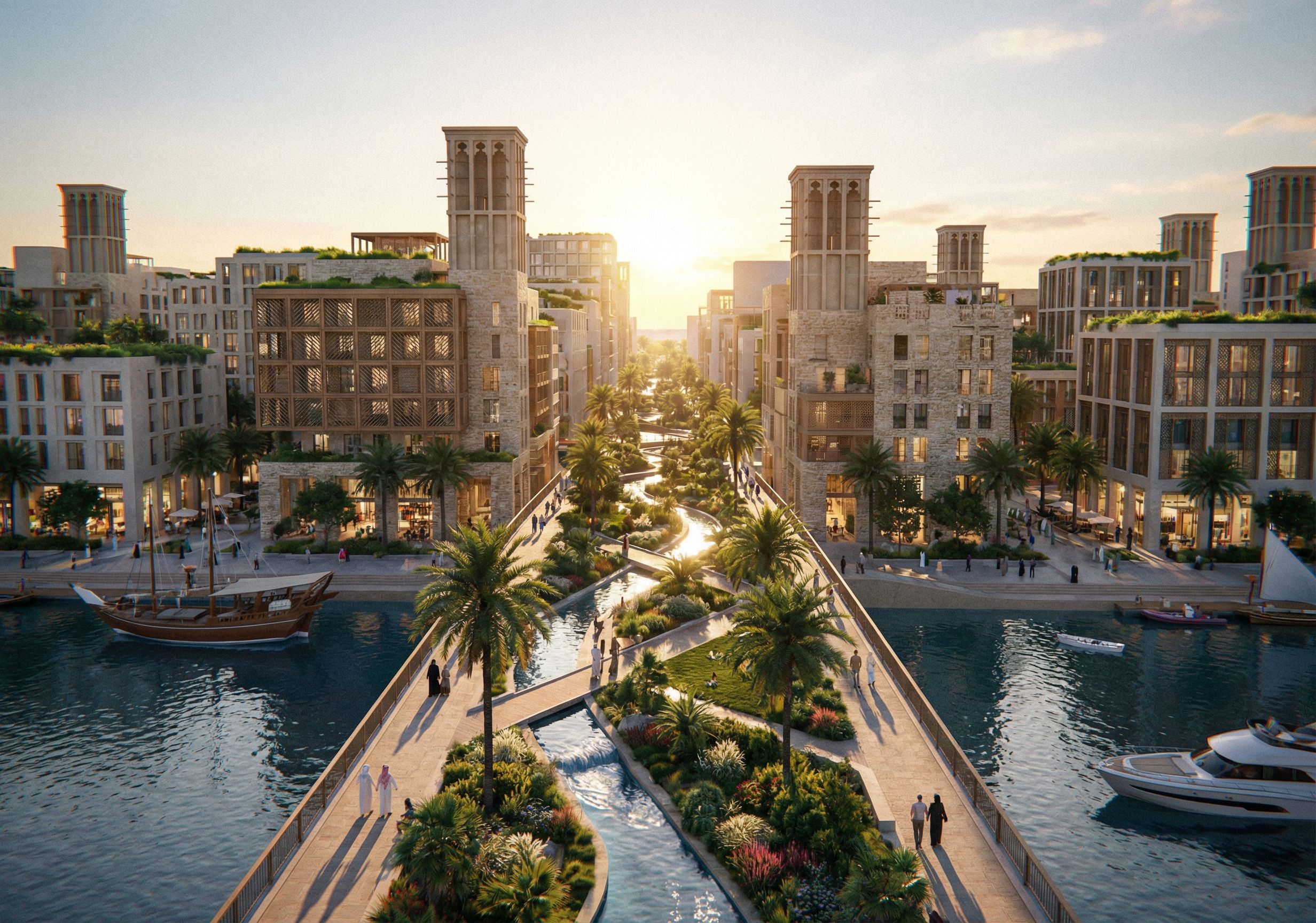 innovation district, with indigenous sustainable mixed use buildings and landscaped bridge pedestrian parks, in Bahrain