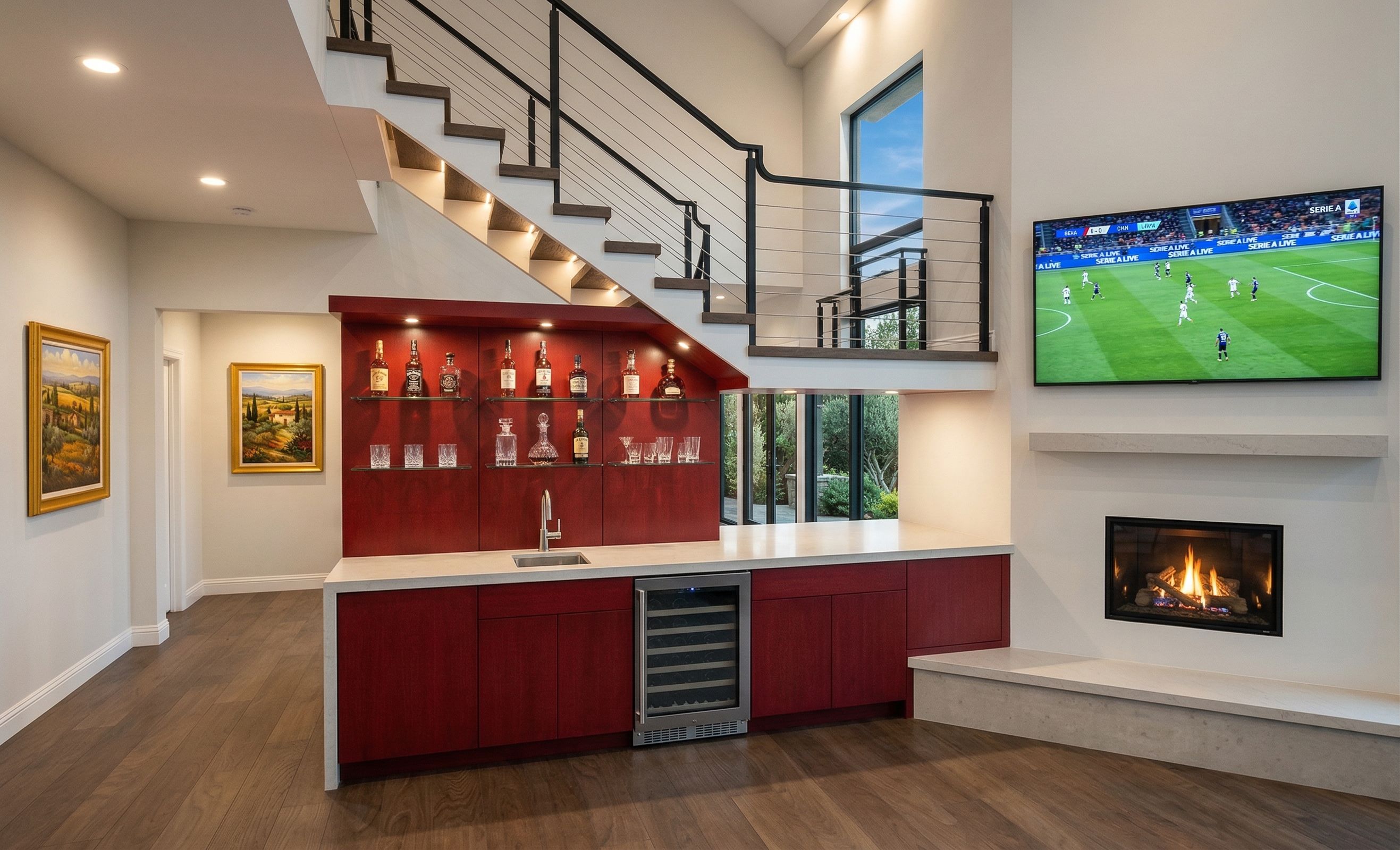 Promptmake photorealistic rendering from this image add wet bar under the stairs next to fireplace as indicated by red area design it so the fireplace and wet bar are connected Wet bar has glass shelves fireplace is direct vent gas fireplace, show fireplace on burning, fireplace wall is drywall railing is black steel TV above the fireplace is playing Italian soccer game change yellow picture frame to Italian countryside scene skies trough the existing stair window do not add windows keep existing windows do not add doors keep existing doors green scenery through lower glass door and windows add lighting under the stair steps lights on in the room add light fixtures where appropriate, keep exact camera angle
