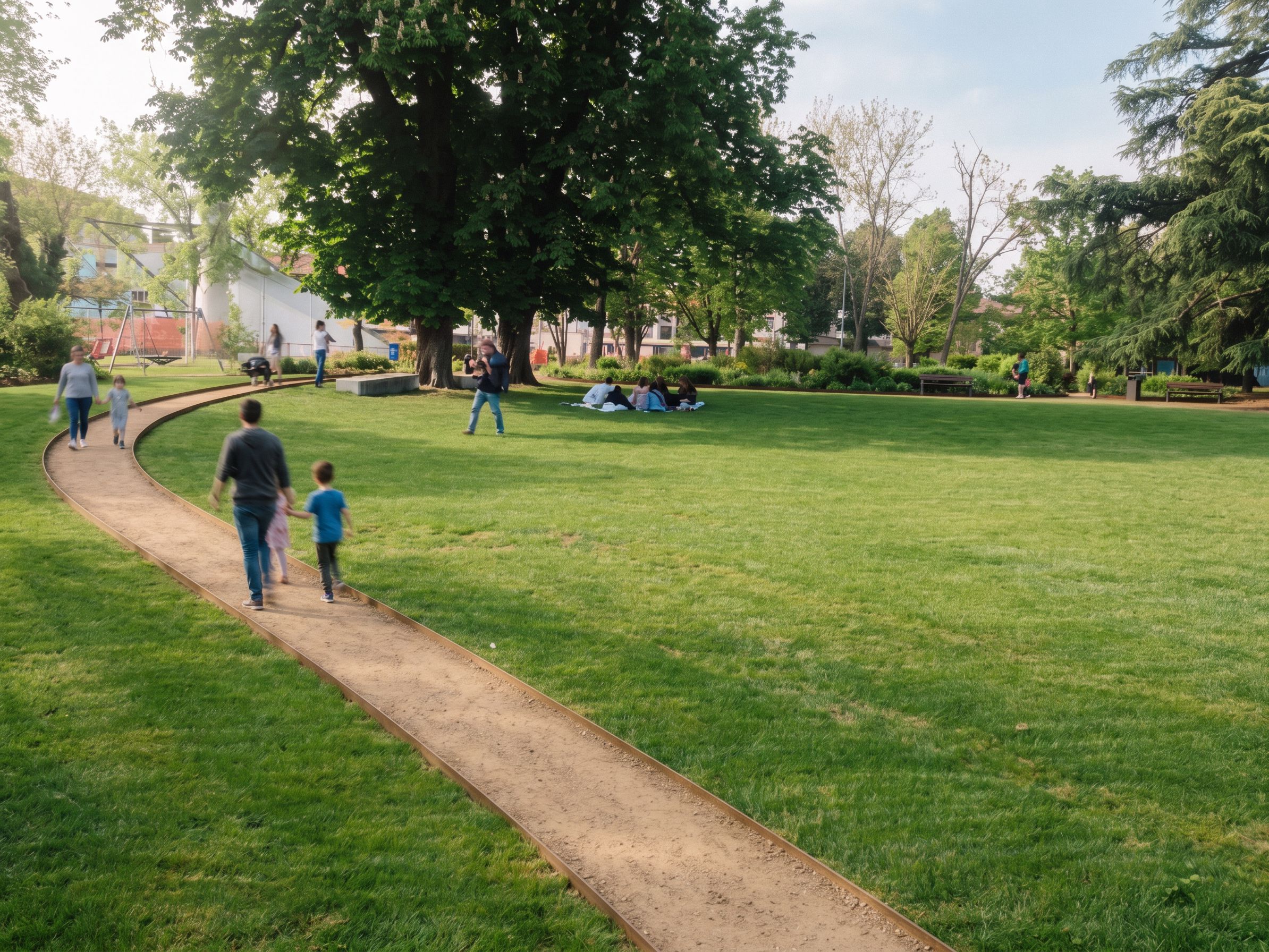 Nel render come da immagine nella posizione disegnata definisci meglio percorso naturalistico in terra stabilizzata colore marrone chiaro delimtato da bordura in corten a filo prato Migliora il prato più curato e verde . Inserisci persone e bambini che camminano nel sentiero. Sullo sfondo inserisci piantumazioni a coprire gli edifici, keep exact camera angle