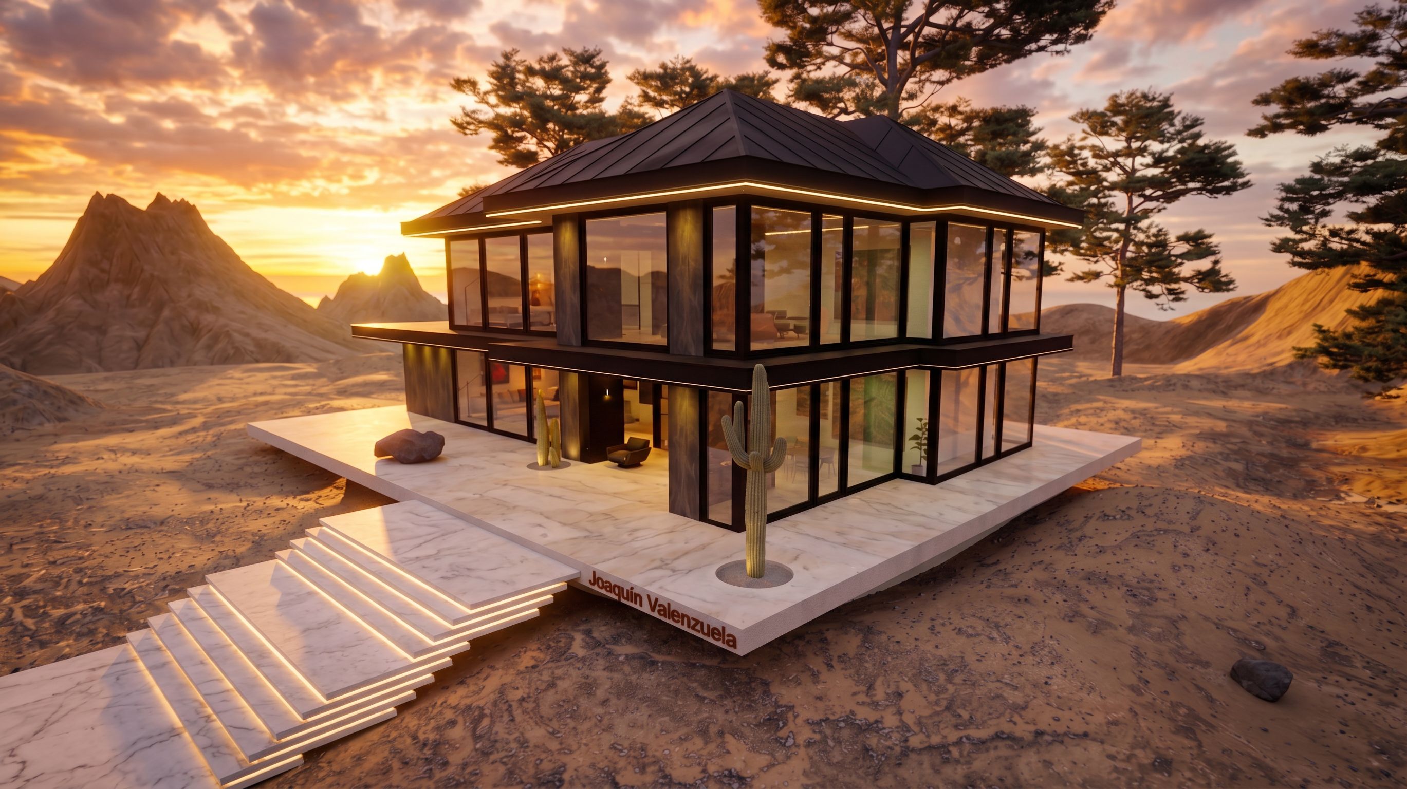 PromptAñade una planta superior con un gran tejado negro moderno a 6 aguas con luces en su parte interior y que siga la misma dinámica de diseño del resto de la casa sustituye los suelos por un revestimiento de marmol de Carrara blanco con betas grises de lujo. añade iluminación por debajo de los escalones.