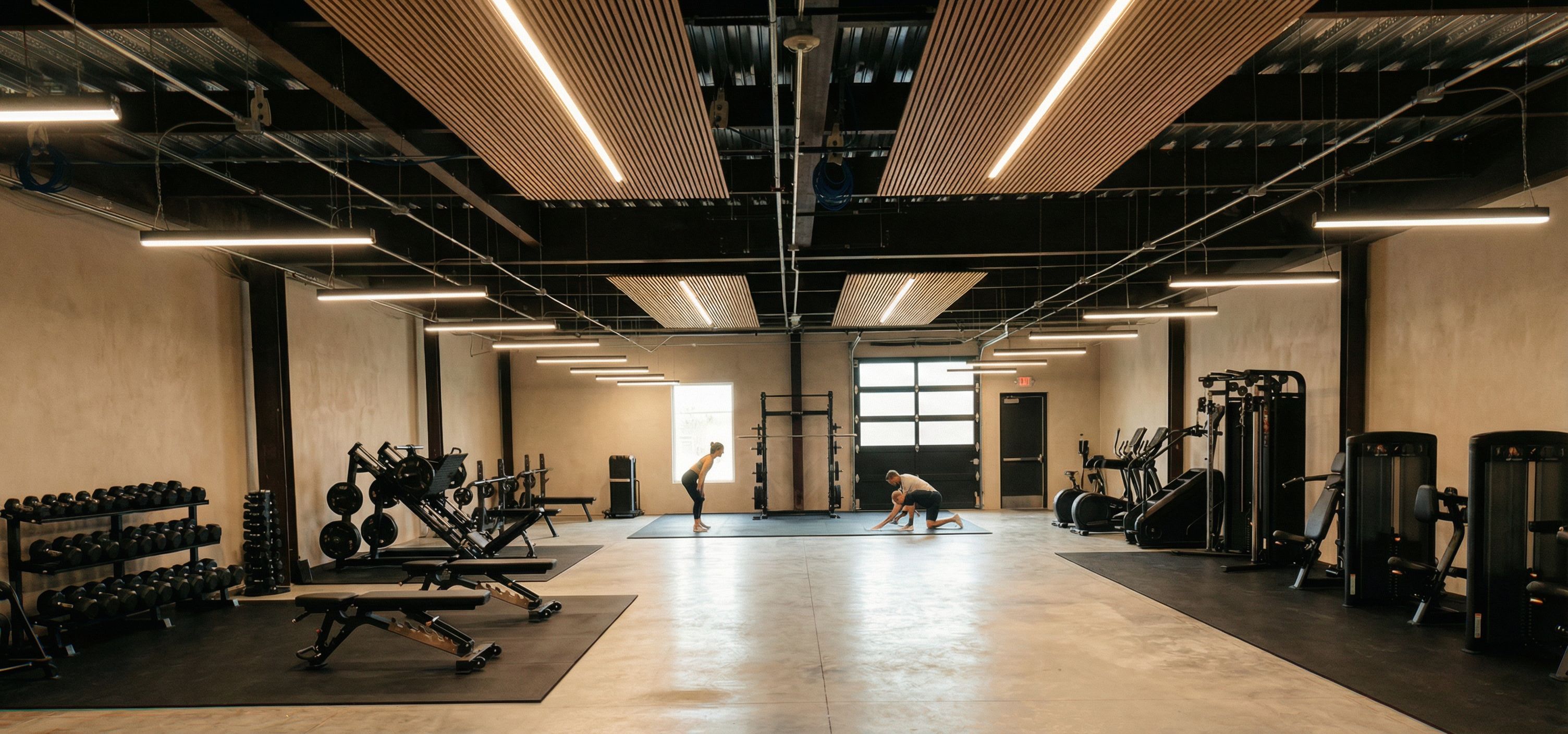 Keep the exact camera angle, lighting, ceiling treatment, equipment layout, and material palette unchanged. Replace the window directly beside the exit door behind the squat rack area with a full-height matte black overhead garage door. The garage door should align vertically between the steel columns and match the height proportion of the existing window opening but extend to near ceiling height for impact. Use a modern sectional overhead door with slim horizontal panel divisions and dark metal framing. Upper panels may include subtle frosted glazing to allow diffused daylight while maintaining the warm interior mood. Remove the existing window entirely in that location. Keep the far-left window unchanged. Maintain warm 3000K lighting, wood slat ceiling panels, beige plaster walls, polished concrete floors, and matte black equipment exactly as shown. The overhead door should feel integrated into the industrial structure — intentional, clean, and symmetrical with the steel framing. Preserve the refined boutique wellness gym atmosphere — warm, grounded, high-end, not commercial warehouse.