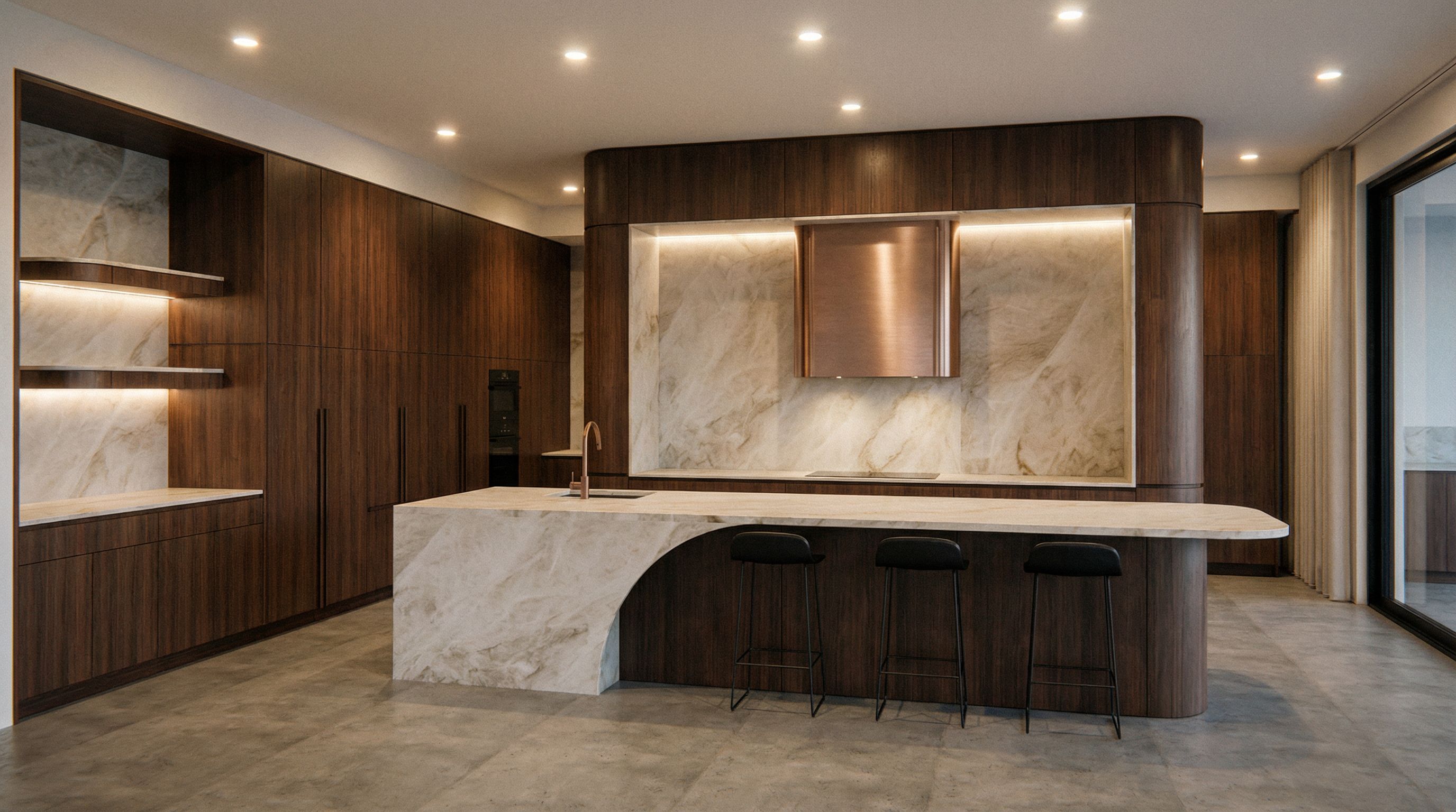 Prompta Modern Kitchen with dark timber cabinets and taj mahal stone , keep exact camera angle