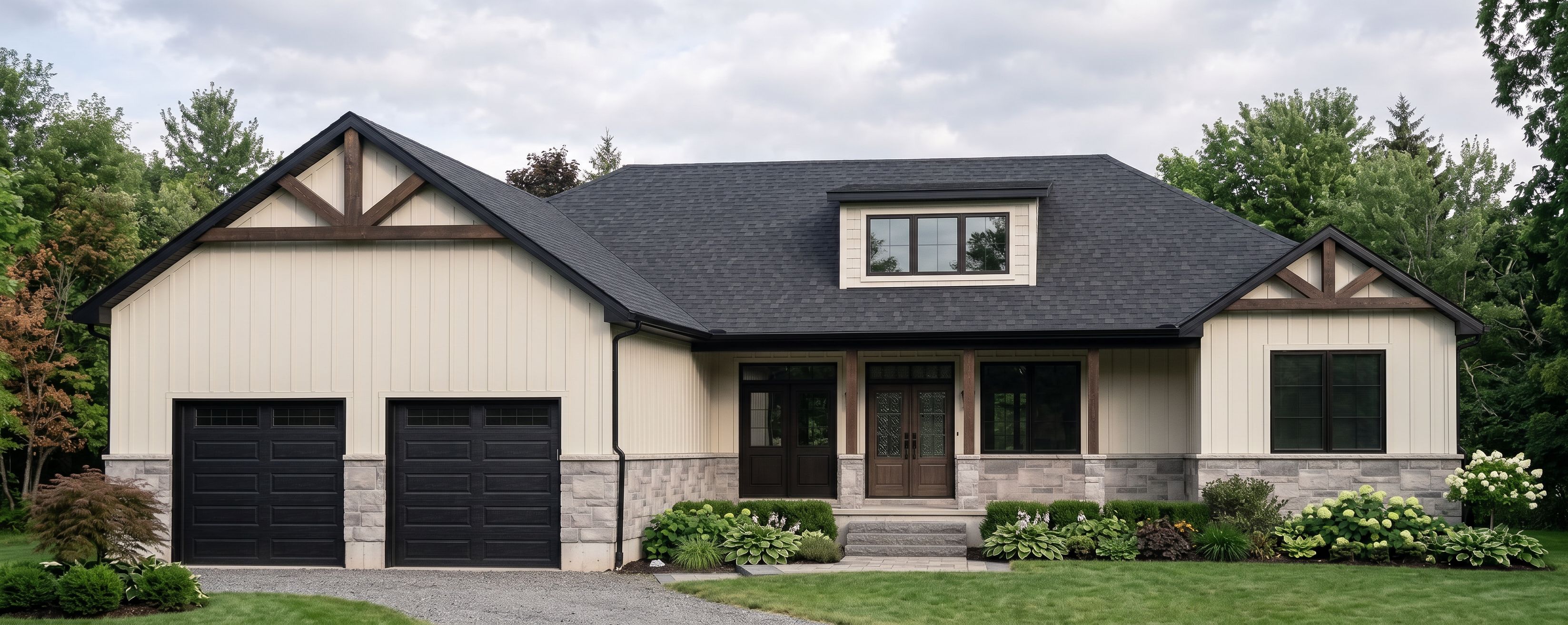 PromptOne photo of a modern residential house featuring a combination of textured stone and VERTICAL siding. The design emphasizes contrasting materials with dark trim accents and large windows. Set in a tranquil suburban environment, surrounded by lush greenery. Soft, natural daylight illuminates the facade, casting gentle shadows across the entrance. The perspective is angled to showcase the depth of the porch and the garage doors, with a 35mm lens highlighting details and textures., keep exact camera angle