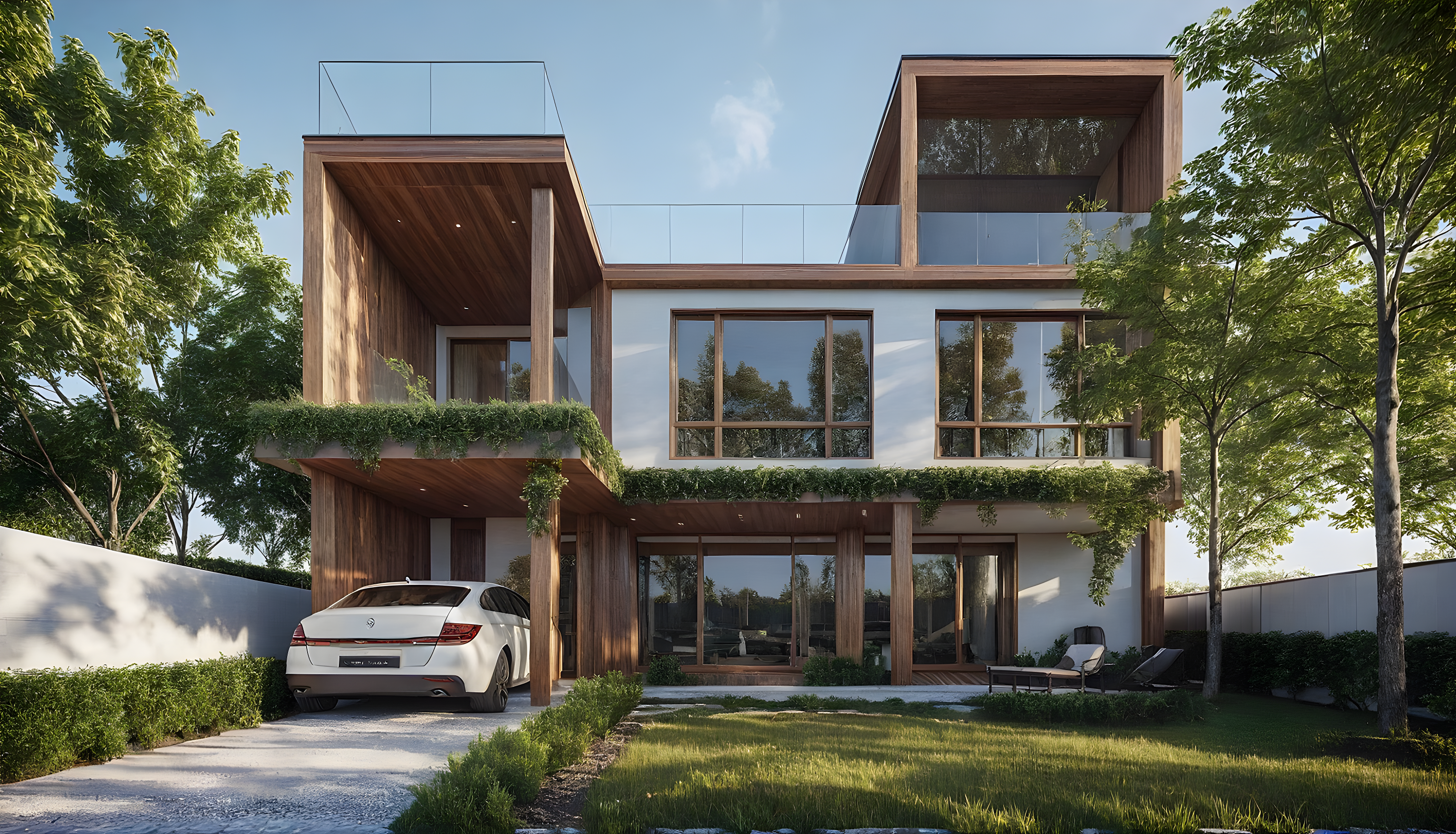 PromptImagine Wooden finish with some long and big windows residential house with ultra modern finish.