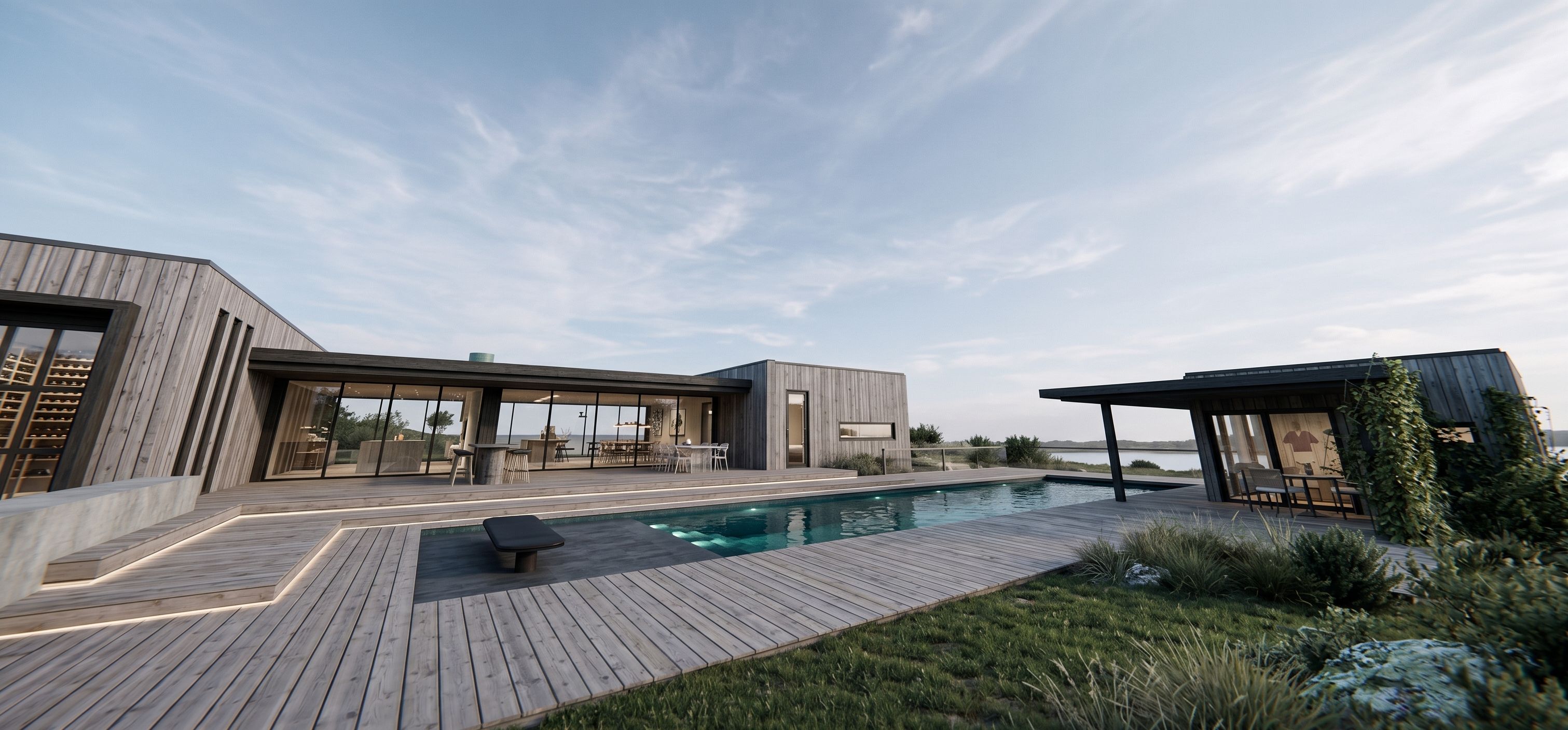 Make picture exactly like picture. Pool area outside building wich has a very horizontal and clean architectural facionable style, clean lines, subtle, nordic, nice, perfect, keep exact camera angle