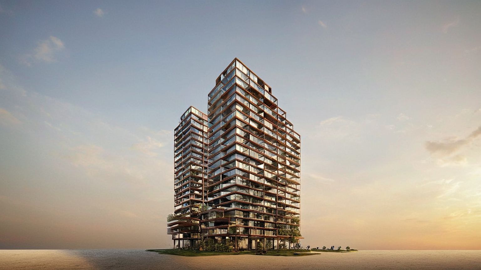 PromptThe architecture features a series of setbacks and terraces with greenery, giving the buildings a visually dynamic appearance. The design emphasizes verticality and a sleek, contemporary style. The setting seems to be urban, likely in a city center with open space around the structures. The lighting suggests a serene time of day, possibly around sunset. This style of architecture often aims to combine aesthetics with functional living or office spaces.