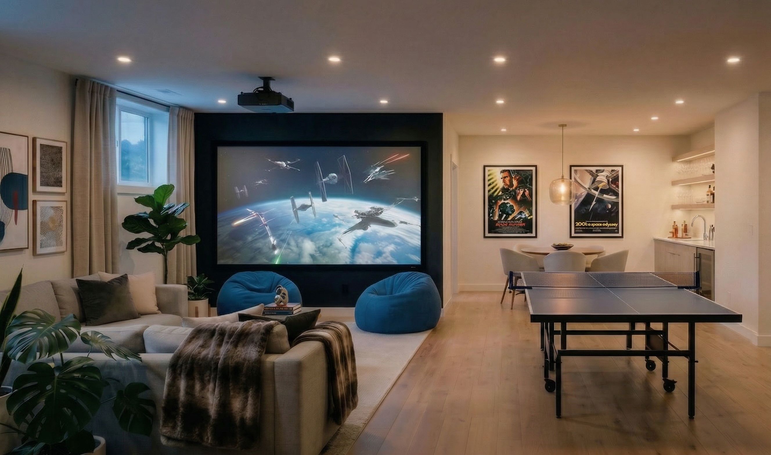 PromptADD TWO MOVIE POSTERS TO THE DINING TABLE AREA, keep exact camera angle