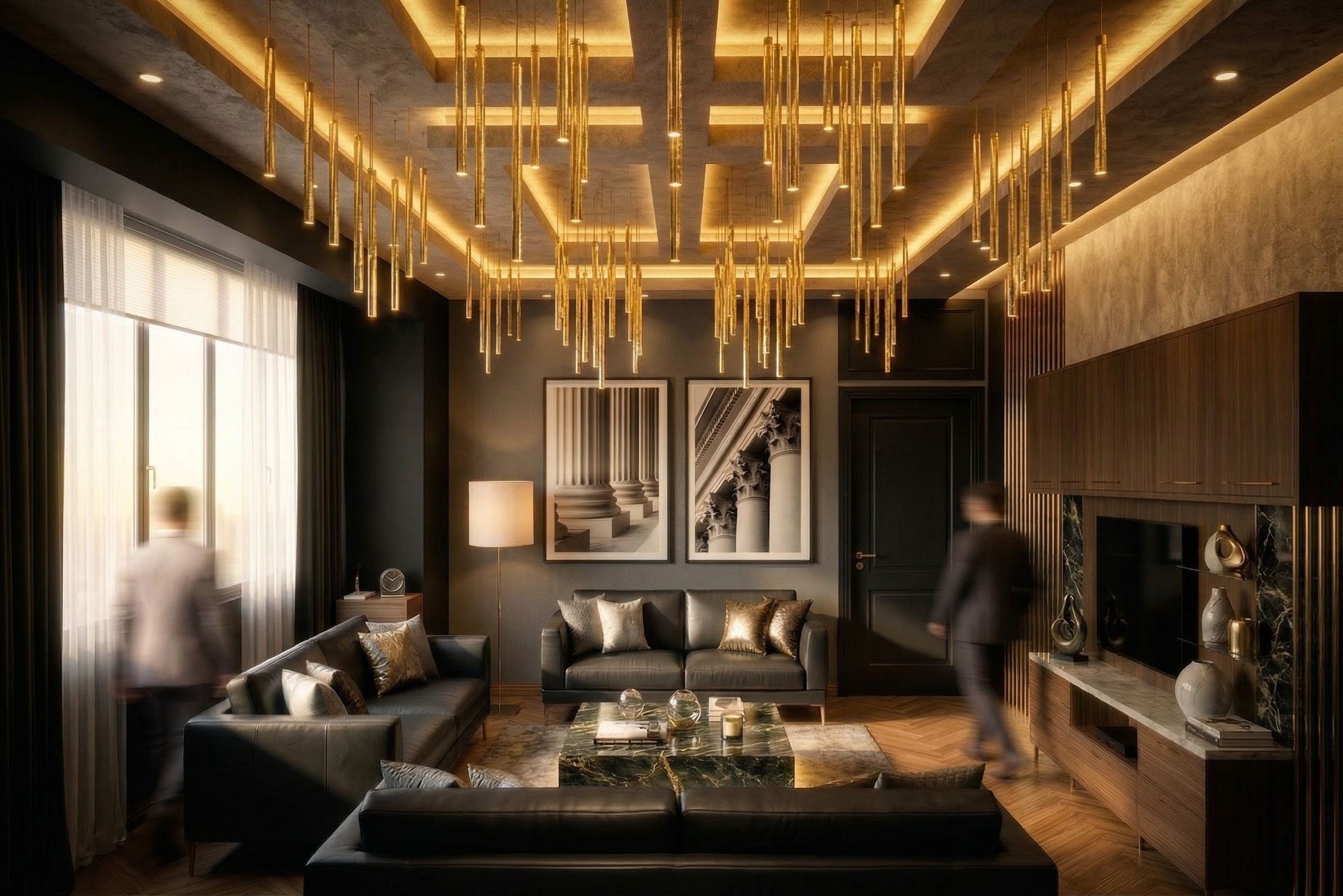 a esta misma imagen añade color negro a la puerta ya la pared sobre la puerta. añade color negro a la pared a la izquierda de panel cenefa y a las paredes de la izquierda del todo cambia el color de los sillones por piel negra. añade cortinas negras y bajo ellas cortinas de visillo blanco., keep exact camera angle