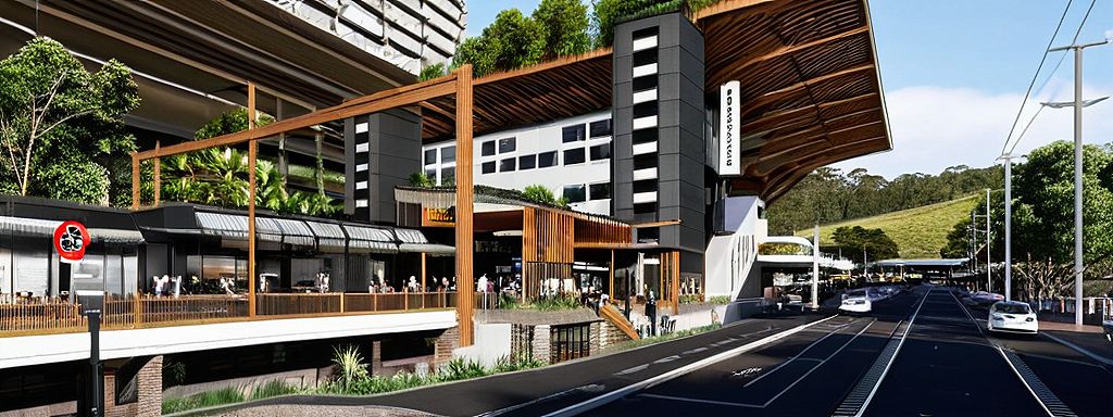 Prompt the site is going to be at Boondall (Australia) train station. the design is an urban planning integration to better the economy and connect the residential and entertainment zone divided by the train line. the new development is an expansion on what is already a pedestrian passover between the two Boondall train station platforms. included in the current passover is stairways and an elevator on each platform. my design idea is to build off this, and have an above-ground and over the train line, transverse design corridor, highlighting the connection between the two sides outside of the train station split by the dividing train line - the entertainment centre carpark on one side, and the high-density residential on the other. in the building, lining the corridor (take inspiration from brisbane central train station, and brisbane's fortitude valley station, and have a cafe, restaurant, bathroom, grocer, atms, and seating available and lining the corridor. the design is NOT residential, only food services