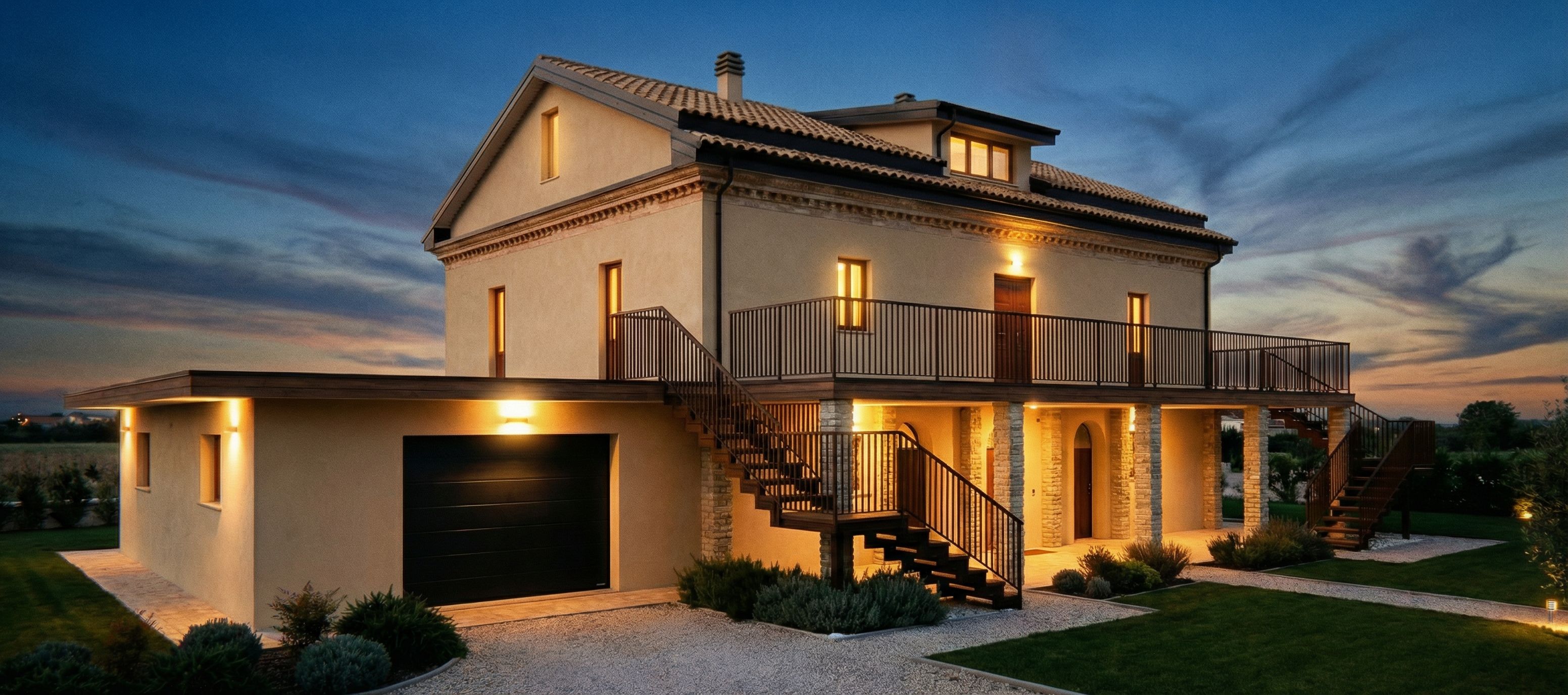 Promptadd dark brown metal railings to the left first-floor terrace., keep exact camera angle