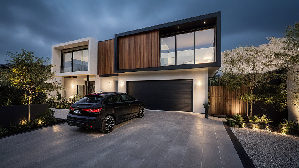 Promptafternoon linear home, concrete textured driveway, wall colours combinations of natural whites and black, dark garage door
